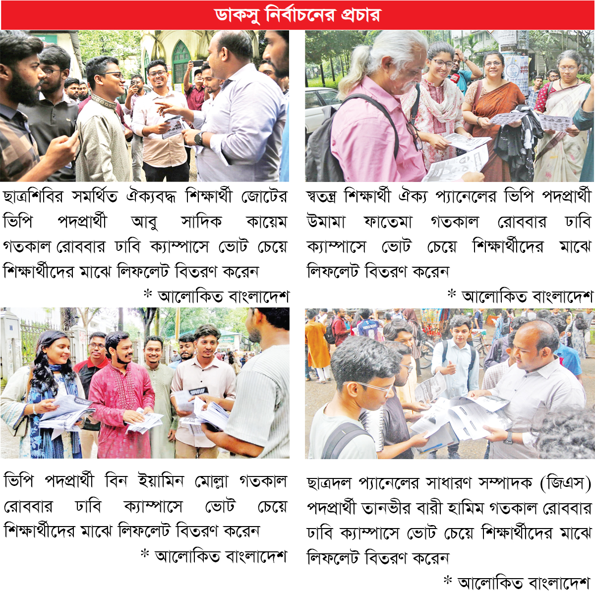 ডাকসু নির্বাচন : * রিটকারীকে অভিনন্দন জানালেন শিবিরের প্রার্থী ফরহাদ * জনপ্রিয়তায় ঈর্ষান্বিত হয়ে চরিত্র হনন করা হচ্ছে, অভিযোগ সাদিক কায়েমের * যত নোংরামি করবেন, তত শক্তিশালী হব, বললেন জুমা
