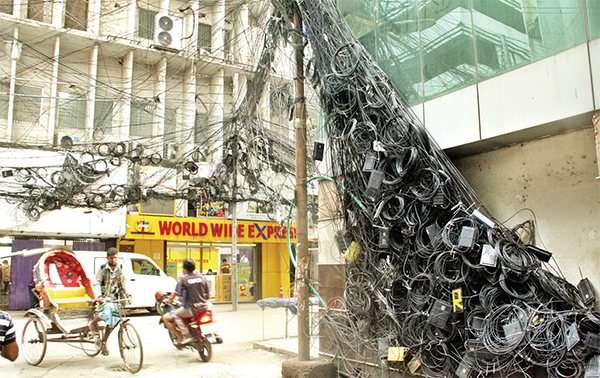 রাজধানীজুড়ে তারের জঞ্জাল। নষ্ট হচ্ছে ঢাকার সৌন্দর্য। ইন্টারনেট, ক্যাবল টিভি নেটওয়ার্কসহ নানা ধরনের ঝুলন্ত তারে সয়লাব। ছবিটি গতকাল মতিঝিল এলাকা থেকে তোলা * এম খোকন সিকদার