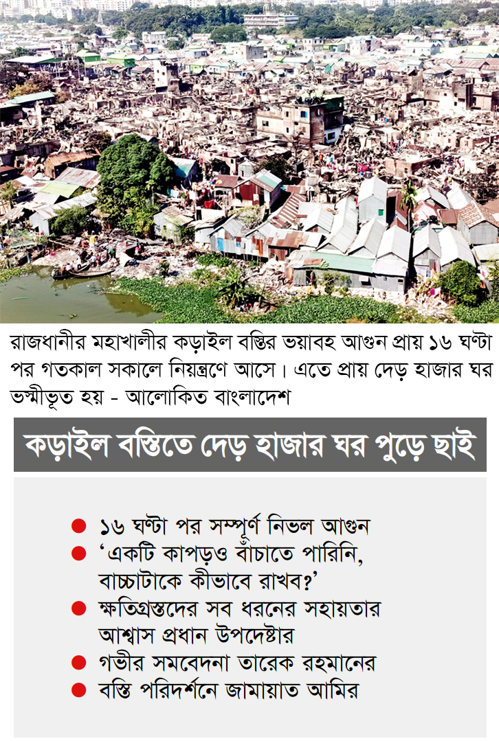 কড়াইল বস্তিতে দেড় হাজার ঘর ভস্মীভূত : ফায়ার সার্ভিসের ১৯টি ইউনিটের চেষ্টায় দীর্ঘ পাঁচ ঘণ্টার বেশি সময় পর নিয়ন্ত্রণে আসে রাজধানীর মহাখালী এলাকায় কড়াইল বস্তির আগুন। এই ভয়াবহ অগ্নিকাণ্ডে দেড় হাজারের মতো ঘর পুড়েছে বলে জানায় ফায়ার সার্ভিস। গত মঙ্গলবার বস্তিতে আগুন লাগার পর প্রথমে সাতটি ইউনিট পাঠানো হলেও আগুনের তীব্রতা বাড়ায় ধাপে ধাপে ইউনিট সংখ্যা বাড়ানো হয়। সন্ধ্যা সাড়ে ৬টার দিকে ইউনিট বাড়িয়ে করা হয় ১৬টি, পরে আরও তিনটি যোগ হয়ে মোট ১৯টি ইউনিট কাজ শুরু করে। রাত ১০টা ৩৫ মিনিটের দিকে আগুন নিয়ন্ত্রণে আসে।