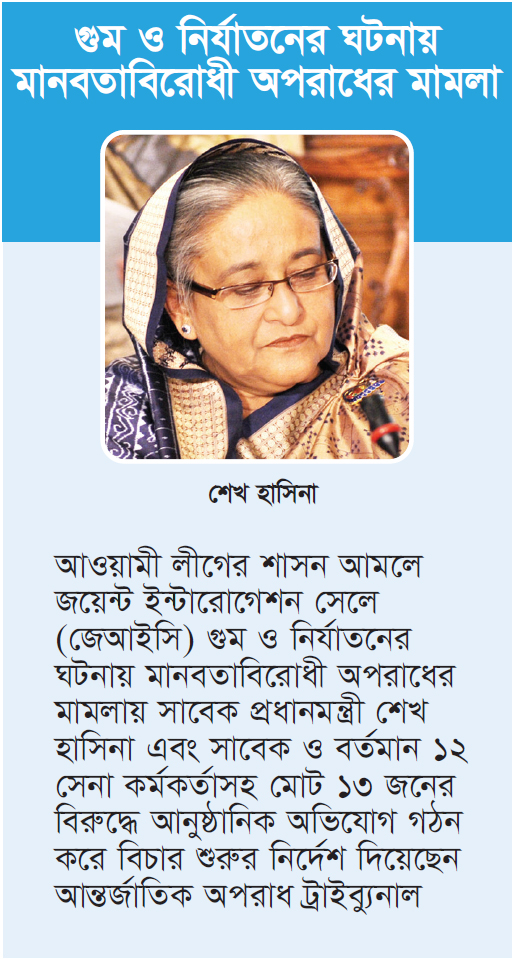 আওয়ামী লীগ সরকারের শাসনামলে জয়েন্ট ইন্টারোগেশন সেলে (জেআইসি) গুম ও নির্যাতনের ঘটনায় মানবতাবিরোধী অপরাধের মামলায় সাবেক প্রধানমন্ত্রী শেখ হাসিনা এবং সাবেক ও বর্তমান ১২ সেনা কর্মকর্তাসহ মোট ১৩ জনের বিরুদ্ধে আনুষ্ঠানিক অভিযোগ গঠন করে বিচার শুরুর নির্দেশ দিয়েছেন আন্তর্জাতিক অপরাধ ট্রাইব্যুনাল। গতকাল বৃহস্পতিবার চেয়ারম্যান বিচারপতি মো. গোলাম মর্তূজা মজুমদারের নেতৃত্বাধীন তিন সদস্যের আন্তর্জাতিক অপরাধ ট্রাইব্যুনাল-১ এ আদেশ দেন। একইসঙ্গে আগামী ১৯ জানুয়ারি প্রসিকিউশনের সূচনা বক্তব্য উপস্থাপনের জন্য তারিখ নির্ধারণ করেন। অভিযোগ গঠনের মধ্যে দিয়ে এই মামলার বিচার শুরু হল। এদিন কড়া নিরাপত্তার মধ্য দিয়ে এ মামলায় গ্রেপ্তার তিন আসামিকে ট্রাইব্যুনালে হাজির করে পুলিশ। তারা হলেন- ডিজিএফআইয়ের সাবেক পরিচালক মেজর জেনারেল শেখ মো. সরওয়ার হোসেন, ব্রিগেডিয়ার জেনারেল মো. মাহবুবুর রহমান সিদ্দিকী ও ব্রিগেডিয়ার জেনারেল আহমেদ তানভির মাজহার সিদ্দিকী।