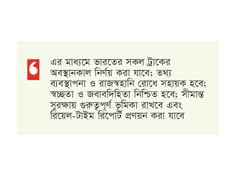 এনবিআর বলছে, “এর মাধ্যমে ভারতের সকল ট্রাকের অবস্থানকাল নির্ণয় করা যাবে; তথ্য ব্যবস্থাপনা ও রাজস্বহানি রোধে সহায়ক হবে; স্বচ্ছতা ও জবাবদিহিতা নিশ্চিত হবে; সীমান্ত সুরক্ষায় গুরুত্বপূর্ণ ভূমিকা রাখবে এবং রিয়েল-টাইম রিপোর্ট প্রণয়ন করা যাবে।”