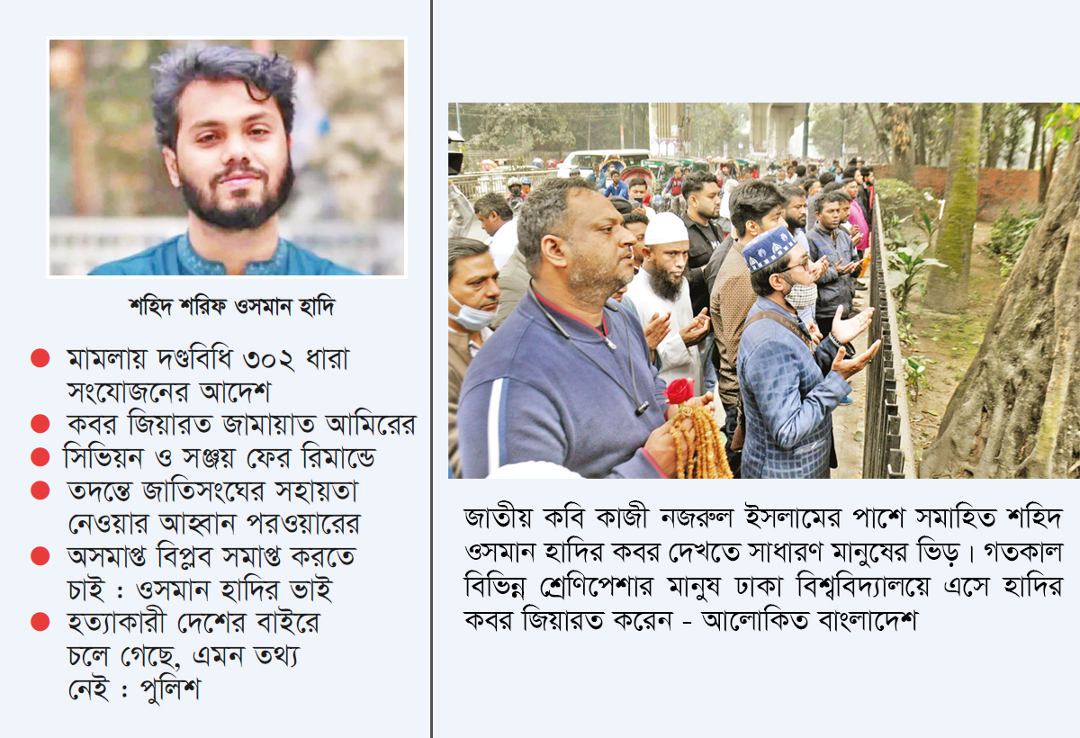 ওসমান হাদির কবর জিয়ারত করলেন জামায়াতের আমির : ইনকিলাব মঞ্চের আহ্বায়ক শরিফ ওসমান বিন হাদির কবর জিয়ারত করেছেন বাংলাদেশ জামায়াতে ইসলামীর আমির শফিকুর রহমান। গতকাল রোববার ভোরে ঢাকা বিশ্ববিদ্যালয়ের কেন্দ্রীয় জামে মসজিদে ফজরের নামাজ আদায়ের পর তিনি ওসমান হাদির কবর জিয়ারত করেন। গতকাল সকাল ৭টা ৫০ মিনিটের দিকে জামায়াতের ভেরিফায়েড ফেসবুক পেজে দেওয়া এক পোস্টে এ তথ্য জানানো হয়। এ সময় শফিকুর রহমানের সঙ্গে জামায়াতের নেতাকর্মীরা ছিলেন। ওসমান হাদির রুহের মাগফিরাত কামনা করেন তারা। জামায়াতের আমিরের সঙ্গে উপস্থিত ছিলেন সংগঠনের সেক্রেটারি জেনারেল মিয়া গোলাম পরওয়ার, সহকারী সেক্রেটারি জেনারেল মাওলানা আবদুল হালিম, ইসলামী ছাত্রশিবিরের কেন্দ্রীয় সভাপতি জাহিদুল ইসলাম, বাংলাদেশ জামায়াতে ইসলামীর কেন্দ্রীয় নির্বাহী পরিষদ সদস্য মো. মোবারক হোসাইন, ডাকসুর ভিপি সাদিক কায়েম, জিএস এসএম ফারহাদ প্রমুখ।