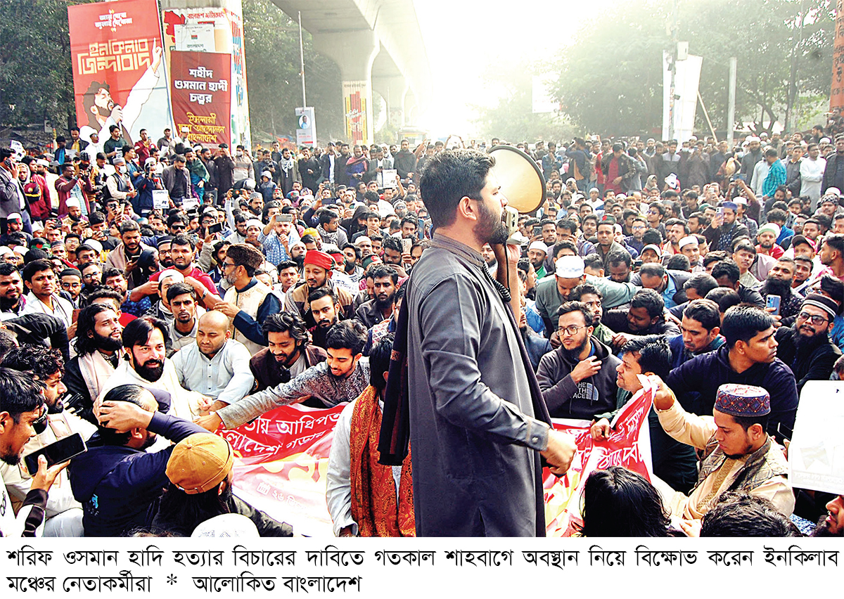 ইনকিলাব মঞ্চের আহ্বায়ক শরিফ ওসমান বিন হাদি হত্যার বিচার দাবিতে রাজধানীর শাহবাগ মোড় অবরোধ করে বিক্ষোভ করছেন তার সংগঠনের নেতাকর্মীরা। এই কর্মসূচিতে বিভিন্ন শ্রেণি-পেশার মানুষও রয়েছেন। পূর্বঘোষণা অনুযায়ী গতকাল শুক্রবার জুমার নামাজের পর এই কর্মসূচি শুরু করে ইনকিলাব মঞ্চ। বিকেল ৪টায় এই প্রতিবেদন লেখা পর্যন্ত কর্মসূচি চলছিল। শহিদ ওসমান হাদি জুলাই গণঅভ্যুত্থানের মুখ। তিনি গত বছরের আগস্টে ইনকিলাব মঞ্চ গঠন করেন। ঢাকা-৮ আসনের সম্ভাব্য প্রার্থী ছিলেন তিনি। অনেক দিন ধরে তিনি গণসংযোগ করে আসছিলেন।