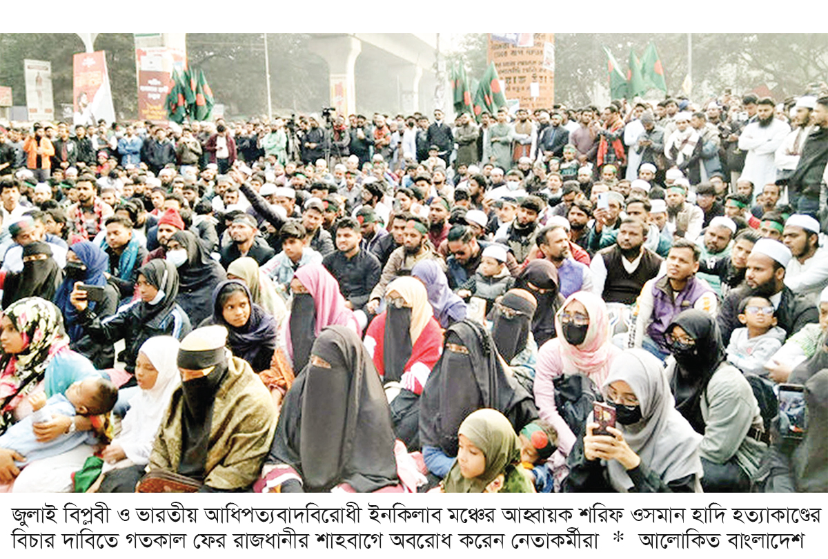 এদিকে, ইনকিলাব মঞ্চের মুখপাত্র শহীদ শরীফ ওসমান হাদির হত্যার বিচারের দাবিতে তৃতীয়বারের মতো গতকাল শুক্রবার রাজধানীর শাহবাগ চত্বর অবরোধ করেছে ইনকিলাব মঞ্চ। এদিন জুমার নামাজের পর ঢাকা বিশ্ববিদ্যালয়ের কেন্দ্রীয় মসজিদ থেকে বিক্ষোভণ্ডমিছিল শুরু করে ইনকিলাব মঞ্চের নেতাকর্মীরা শাহবাগ মোড়ে গিয়ে অবস্থান নেন। এ সময় ইনকিলাব মঞ্চের সদস্য সচিব আবদুল্লাহ আল জাবের রাজনৈতিক দলগুলোর উদ্দেশে বলেন, আপনাদের সঙ্গে যদি কেউ বৈঠক করতে আসে, আপনারা অবশ্যই বৈঠক করবেন। কিন্তু সেই বৈঠক হতে হবে ওপেন। কোনো সিক্রেট বৈঠক নেই। দিল্লির সঙ্গে আমাদের কোনো গোপন বৈঠক চলবে না। তিনি আরও বলেন, বাংলাদেশের তিন পাশ থেকে ভারতীয় আধিপত্যবাদ, যার কারণে আমরা ভারতীয় আধিপত্যের বিপক্ষে কথা বলি। এখন যদি আমেরিকা বাংলাদেশে আধিপত্যবাদ খাটাইতে চায়, আমরা কি আমেরিকার বিরুদ্ধে কথা বলব না? আমরা কি কারও কাছে বাংলাদেশের স্বাধীনতা ও সার্বভৌমত্ব দিয়ে দেব? না, দেব না। আমাদের এই লড়াইটা কেবলমাত্র শুরু।