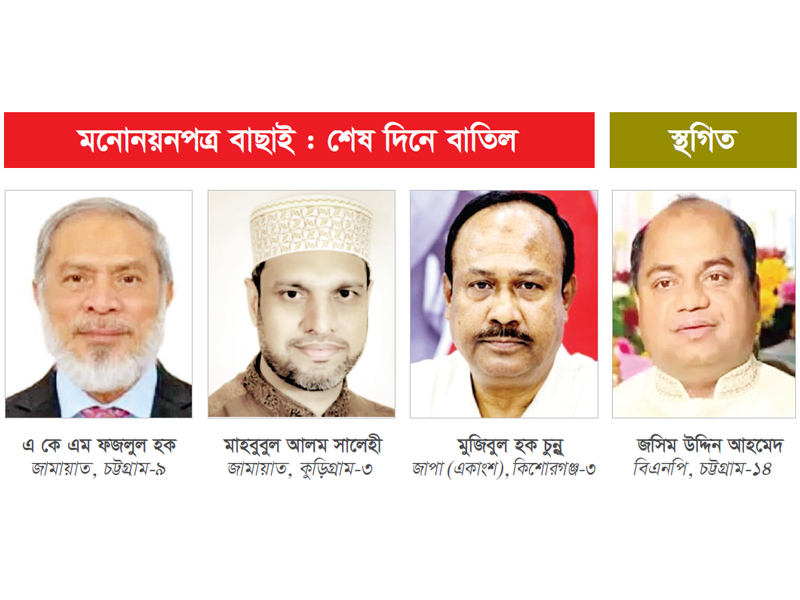 চট্টগ্রাম ও কুড়িগ্রামে জামায়াতে ইসলামীর দুই প্রার্থীর মনোনয়ন বাতিল : দ্বৈত নাগরিকত্ব থাকায় চট্টগ্রাম ও কুড়িগ্রামে জামায়াতে ইসলামীর দুই প্রার্থীর মনোনয়ন বাতিল করেছে সংশ্লিষ্ট নির্বাচন কর্মকর্তারা। গতকাল রোববার যাচাই-বাছাই শেষে চট্টগ্রাম-৯ (কোতোয়ালী) আসনে জামায়াত প্রার্থী ড. এ কে এম ফজলুল হক ও কুড়িগ্রাম-৩ (উলিপুর) আসনে একই দলের প্রার্থী মাহবুবুল আলম সালেহীর মনোনয়ন বাতিল করা হয়েছে।