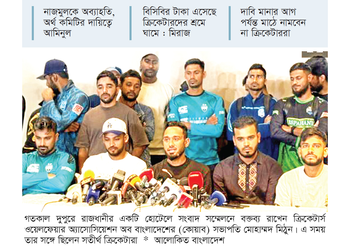 মেহেদী হাসান মিরাজ বলেন, ‘একটা জিনিস ক্লিয়ার করা উচিত। আমরা খারাপ খেললে অনেকেই বলে আপনারা খারাপ খেলতেছেন আমাদের টাকায়তো আপনারা চলেন, আমরা টাকা দেই বলেইতো আপনারা খেলছেন। জিনিসটা আসলে এরকম না। আমরা যেই টাকাটা আয় করি তার সর্বোচ্চটা আইসিসি এবং স্পনসর থেকে আসে।’ মিরাজ আরও বলেন, ‘আজকে ক্রিকেট বোর্ডের যেই টাকাটা আছে আমার কাছে মনে হয় যারা জাতীয় দলে প্রথম থেকে এখন পর্যন্ত খেলছে তাদেরও এখানে একটা অংশ আছে। মাঠে খেলা হচ্ছে বলেই বোর্ড ভালো জায়গায় আছে। খেলাই যদি না হয় স্পন্সরও আসবে না, আইসিসি থেকে লভ্যাংশও আসবে না। প্রত্যেকটা মানুষের জানা উচিত যে আমরা কিন্তু সরকারকে ট্যাক্স দেই, এবং আমরা যে টাকা পাই সেটা সরকার দেয় না। সেটা স্পন্সর এবং আইসিসি থেকে আসে।’ ক্রিকেটারদের সংগঠন কোয়াবের সভাপতি মোহাম্মদ মিঠুন বলেন, ‘আমরা অবশ্যই খেলতে চাই, তবে আমাদের দাবীগুলা মানার পরে। বিসিবি থেকে সুষ্ঠু সমাধান হলে, আমরা অবশ্যই মাঠে যাব। আমরা খেলার বিপক্ষে না। কিন্তু সবকিছুর তো একটা লিমিট আছে। এখানে শুধু আমার না, পুরো ক্রিকেট অঙ্গনকে প্রশ্নবিদ্ধ করেছে। সবাইকে অপমান করা হয়েছে।’