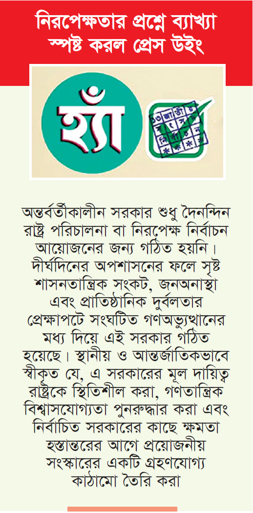 সংস্কার ও গণভোটকে বাংলাদেশের বাস্তব সংকটের প্রেক্ষাপটে ব্যাখ্যা করে প্রেস উইং জানায়, এটি কোনো বিমূর্ত নীতিগত প্রশ্ন নয়। বরং দীর্ঘদিনের শাসন ব্যর্থতার জবাব, যা বছরের পর বছর নাগরিক সমাজ ও আন্তর্জাতিক সম্প্রদায়কে উদ্বিগ্ন করেছে, রাষ্ট্রীয় প্রতিষ্ঠানগুলোকে দুর্বল করেছে এবং প্রতিদ্বন্দ্বিতাহীন নির্বাচন ও তত্ত্বাবধানকারী সংস্থার রাজনীতিকরণের মাধ্যমে দেশকে সংকটে ফেলেছে।