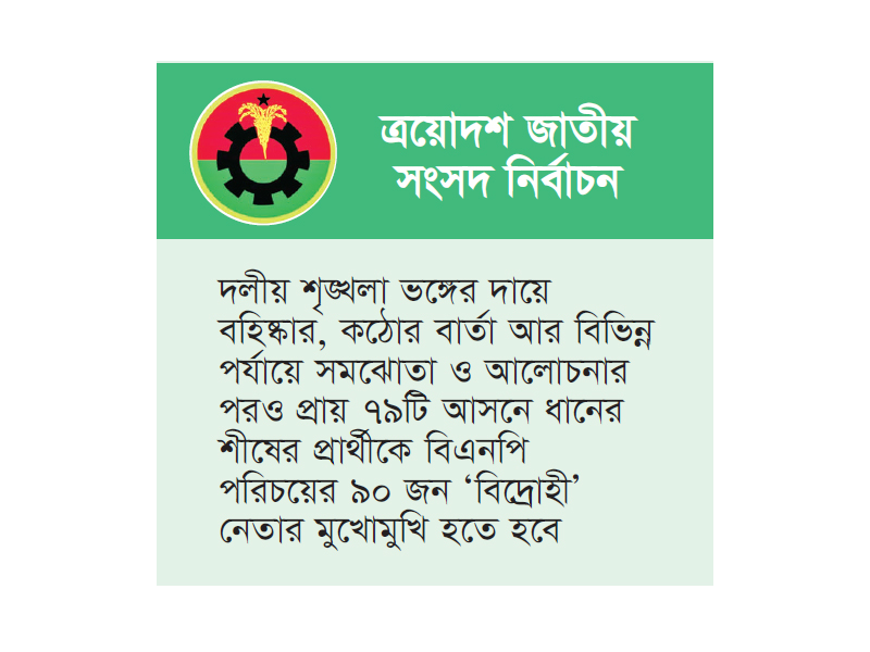 আসন্ন ত্রয়োদশ জাতীয় সংসদ নির্বাচন কেন্দ্র করে দলীয় শৃঙ্খলা ভঙ্গের দায়ে বহিষ্কার, কঠোর বার্তা আর বিভিন্ন পর্যায়ে সমঝোতা ও আলোচনার পরও প্রায় ৭৯টি আসনে ধানের শীষের প্রার্থীকে বিএনপি পরিচয়ের ৯০ জন ‘বিদ্রোহী’ নেতার মুখোমুখি হতে হবে।