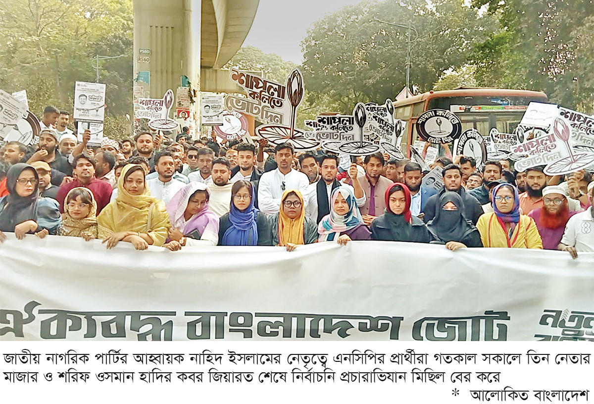বাংলাদেশের ইতিহাসের দুই জাতীয় নেতা শেরেবাংলা এ কে ফজলুল হক ও হোসেন শহীদ সোহরাওয়ার্দী, জাতীয় কবি কাজী নজরুল ইসলাম ও গত ডিসেম্বরে শহীদ হওয়া ইনকিলাব মঞ্চের আহ্বায়ক শরিফ ওসমান বিন হাদির কবর জিয়ারতের মধ্য দিয়ে আনুষ্ঠানিকভাবে ত্রয়োদশ জাতীয় সংসদ নির্বাচনের প্রচার শুরু করেছে জাতীয় নাগরিক পার্টি (এনসিপি)। গতকাল বৃহস্পতিবার নির্বাচনী প্রচার শুরু করে এনসিপির আহ্বায়ক নাহিদ ইসলাম ১০-দলীয় নির্বাচনী ঐক্যকে বিজয়ী করতে জনগণের প্রতি আহ্বান জানান। কবর জিয়ারতের পর জাতীয় কবি কাজী নজরুল ইসলাম ও শহীদ ওসমান হাদির সমাধিসৌধের সামনে থেকে বৃহস্পতিবার বেলা পৌনে একটার দিকে ‘মার্চ ফর জাস্টিস’ শীর্ষক পদযাত্রা বের করে এনসিপি। পদযাত্রাটি শাহবাগ মোড় হয়ে রমনা পার্কের সামনের সড়ক দিয়ে জাতীয় প্রেসক্লাবের সামনে গিয়ে শেষ হয়। এনসিপির আহ্বায়ক নাহিদের নেতৃত্বে এই পদযাত্রায় ছিলেন দলের মুখ্য সমন্বয়ক ও ঢাকা-৮ আসনের প্রার্থী নাসীরুদ্দীন পাটওয়ারী, কেন্দ্রীয় নির্বাচন পরিচালনা কমিটির সেক্রেটারি মনিরা শারমিন, ঢাকা-৯ আসনে দলের প্রার্থী জাবেদ রাসিন, ঢাকা-২০ আসনের প্রার্থী নাবিলা তাসনিদ, জাতীয় যুবশক্তির আহ্বায়ক তারিকুল ইসলাম, কেন্দ্রীয় নেতা ফরহাদ সোহেলসহ অনেকে। ১০-দলীয় ঐক্যের নেতৃত্ব দেওয়া জামায়াতে ইসলামীর পল্টন থানা শাখার আমির শাহিন আহমেদ খান, শাহবাগ থানা শাখার আমির আহসান হাবিবসহ দলটির কিছু নেতা-কর্মীও এ সময় উপস্থিত ছিলেন।