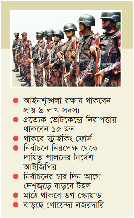 বাড়ছে গোয়েন্দা নজরদারি : ত্রয়োদশ সংসদ নির্বাচনে আইনশৃঙ্খলা পরিস্থিতির যাতে অবনতি না ঘটে, সেজন্য গোয়েন্দা নজরদারি বাড়ানোর সিদ্ধান্ত নেওয়া হয়েছে। প্রতিরক্ষা গোয়েন্দা মহাপরিদপ্তর (ডিজিএফআই), জাতীয় নিরাপত্তা গোয়েন্দা সংস্থা (এনএসআই) এবং পুলিশের বিশেষ শাখা (এসবি)-কে নজরদারি বাড়ানো এবং সম্ভাব্য ঝুঁকির বিষয়ে সজাগ থাকতে বলা হয়েছে। নির্বাচন ঘিরে বিশেষ এই নিরাপত্তা ব্যবস্থার অংশ হিসেবে সশস্ত্র বাহিনী বিভাগ, পুলিশ অধিদপ্তর, বাংলাদেশ কোস্ট গার্ড, আনসার ও ভিডিপি এবং বিজিবি মাঠে সক্রিয় ভূমিকায় থাকছে।