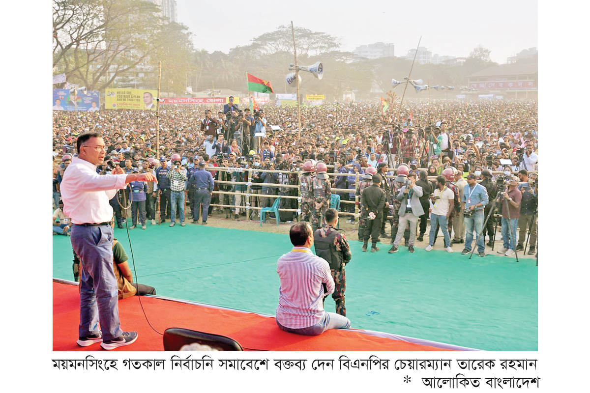 ১২ ফেব্রুয়ারির নির্বাচনে বিএনপিকে জয়ী করতে সকলকে ‘একাত্তরের মতো ঐক্যবদ্ধ’ থাকার আহ্বান জানিয়েছেন বিএনপি চেয়ারম্যান তারেক রহমান। গতকাল মঙ্গলবার বিকালে ময়মনসিংহের সার্কিট হাউজ মাঠে এক নির্বাচনি সমাবেশে বিএনপি চেয়ারম্যান এই আহ্বান করেন। তারেক রহমান বলেন, ১৯৭১ সালে যুদ্ধ হয়েছিল। তরুণ-যুবক যারা তারা আপনারা বইয়ের পাতায় পড়েছেন, মরুব্বি যারা আছে, আমাদের বয়সী যারা আছে তারা দেখেছেন, জানেন সেই যুদ্ধে দেশের স্বাধীনতা অর্জিত হয়েছিল, সেই যুদ্ধে বহু মানুষ শহিদ হয়েছিল। পরবর্তীতে ২৪ সালের ৫ আগস্ট সেই স্বাধীনতাকে রক্ষা করেছে এই দেশের ছাত্র-জনতাসহ সব শ্রেণির পেশার মানুষ। বিএনপি চেয়ারম্যান বলেন, সেই একাত্তর সালের যুদ্ধই হোক, ২৪-এর আন্দোলনই হোক, কে পাহাড়ি মানুষ, কে সমতলের মানুষ, কে বৃহৎ জনগোষ্ঠীর মানুষ এটি; কিন্তু কেউ দেখেনি। রাজপথে সবাই পাশাপাশি আন্দোলন করেছে, একাত্তর সালে যুদ্ধে সবাই একসঙ্গে যুদ্ধ করেছে। কে মুসলাম, কে খ্রিষ্টান, কে অন্য ধর্মের মানুষ কেউ দেখেনি। এবারও ১২ তারিখে নির্বাচনে আমাদের সবাইকে ধর্ম-বর্ণ নির্বিশেষ একসঙ্গে থাকতে হবে। তারেক রহমান এর কারণ ব্যাখ্যা করে বলেন, আমরা যদি একসঙ্গে থাকি, আমরা যেভাবে স্বাধীনতা অর্জন করেছি, আমরা যদি একসঙ্গে থাকি আমরা যেভাবে স্বৈরাচার বিদায় করেছি, আমরা যদি ইনশাআল্লাহ সামনের দিনে একসঙ্গে থাকি তাহলে অবশ্যই এই বাংলাদেশকে ভবিষ্যতে আমাদের সেই প্রত্যাশিত বাংলাদেশের দিকে নিয়ে যেতে পারব। তিনি বলেন, সেই প্রত্যাশিত বাংলাদেশ গড়ে তুলতে হয় তাহলে স্লোগান হবে একটাই। সেটা হলো- করব কাজ, গড়বো দেশ, সবার আগে বাংলাদেশ। সবার মনে রাখতে হবে, আমরা ঐক্যবদ্ধ থাকলেই বাংলাদেশ এগিয়ে যাবে। তারেক রহমান বলেন, আমরা ঐক্যবদ্ধ থাকলে আমাদের প্রত্যাশিত বাংলাদেশ গড়ে তুলতে পারব, আমরা ঐক্যবদ্ধ থাকলেই জনগণের শাসন কায়েম করা সম্ভব হবে, আমরা ঐক্যবদ্ধ থাকলেই জনগণের প্রতি জবাবদিহিতা নিশ্চিত করা সম্ভব হবে। আসুন, আমাদের আজকে শপথ হোক, আমরা এই বাংলাদেশকে জনগণের বাংলাদেশে পরিণত করব, আমরা বাংলাদেশকে জনগণের বাংলাদেশে রূপান্তরিত করব। শেষ কথার এককথা, করব কাজ, গড়ব দেশ, সবার আগে বাংলাদেশ।
