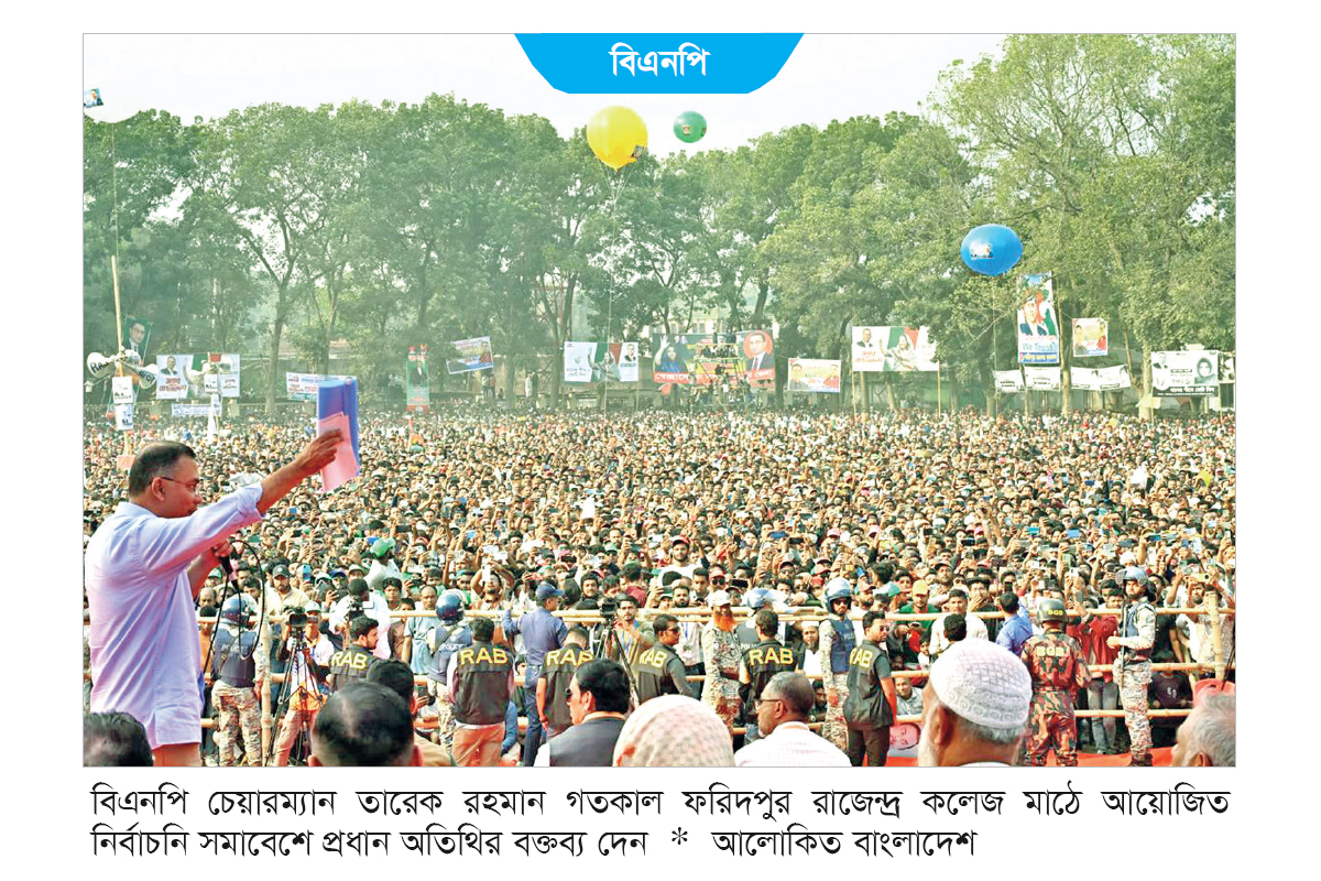 বিগত শাসনামলের কথা উল্লেখ করে তারেক রহমান বলেন, ‘বিগত ১৫ বছর আমরা দেখেছি, জনগণের ভোট নিয়ে কীভাবে নিশিরাতের ভোট হয়েছে। আমরা দেখেছি, নাগরিকের ভোটের অধিকার কেড়ে নিয়ে কীভাবে আমি-ডামির নির্বাচন করা হয়েছিল। কিন্তু ’২৪ সালের ছাত্র-জনতার আন্দোলনের মুখে সেই আমি-ডামির নির্বাচনের মালিক যারা, নিশিরাতের মালিক যারা, তারা জনগণের আন্দোলনের মুখে পালিয়ে যেতে বাধ্য হয়েছে। এখন এই বাংলাদেশ হচ্ছে, জনগণের বাংলাদেশ। এখন এই বাংলাদেশ চলবে জনগণের রায়ের ভিত্তিতে। এ জন্যই দেশের মানুষ ১২ ফেব্রুয়ারি ভোটের মাধ্যমে দেশের মানুষ তাদের পছন্দের প্রতিনিধি নির্বাচন করবে, যারা জনগণের ইচ্ছা অনুযায়ী, জনগণের জবাবদিহি করে দেশ পরিচালনা করবে।’ বরিশালসহ দক্ষিণাঞ্চলের উন্নয়নের বিষয়েও কথা বলেন তারেক রহমান। তিনি বলেন, যোগাযোগবিচ্ছিন্ন ভোলায় সেতু করতে হবে, ভোলায় মেডিকেল কলেজ করতে হবে, দক্ষিণাঞ্চলের কৃষি খাতের উন্নয়নের জন্য সারের সরবরাহ নিশ্চিত করতে হবে, মৎস্য খাতের উন্নয়নে কোল্ড স্টোরেজ, প্রক্রিয়াজাতকরণ কেন্দ্র করতে হবে। ১৯৯৩ সালে বেগম খালেদা জিয়া এই বরিশালকে বিভাগ হিসেবে ঘোষণা করেছিলেন; কিন্তু এখনও অনেক কাজ বাকি। বিশেষ করে সব মানুষের সুচিকিৎসা নিশ্চিত করতে হবে।