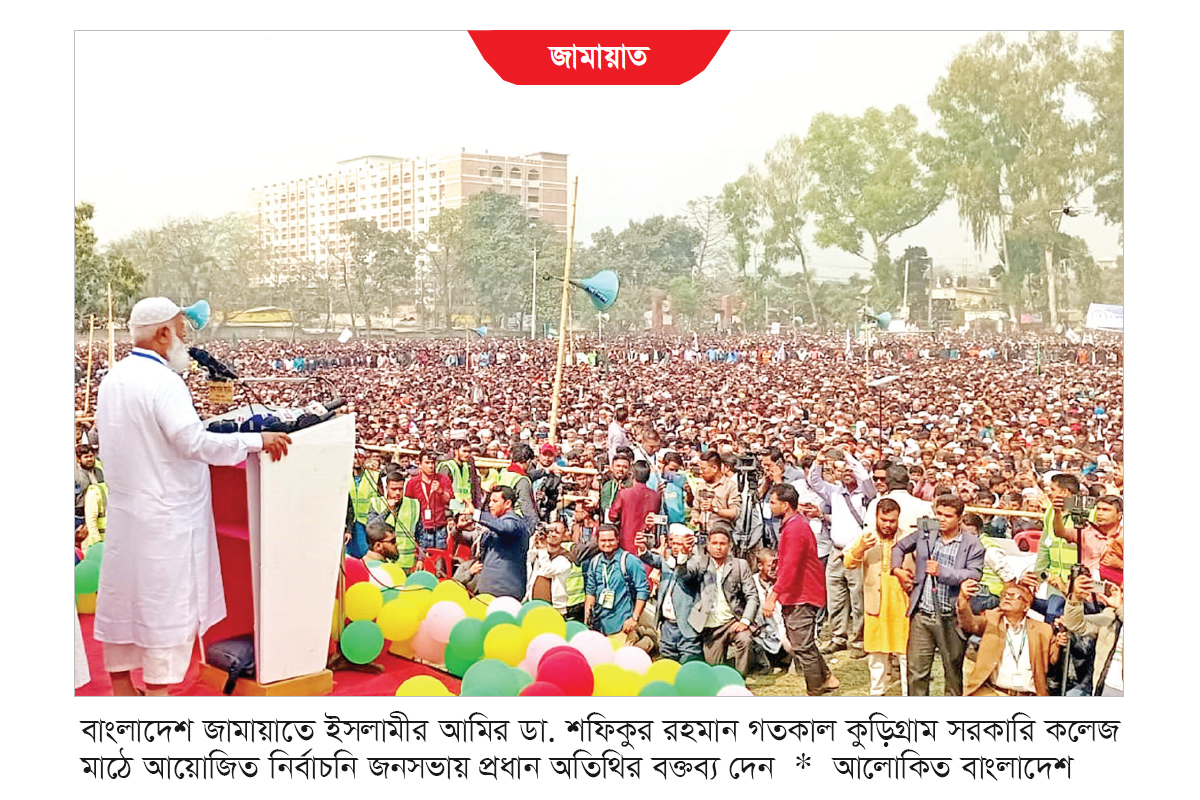 জামায়াতের আমির বলেন, কুড়িগ্রাম জেলার দুঃখ হলো প্রধান তিনটি নদী। বর্ষা আসলেই নদীপাড়ের মানুষের চিন্তা শুরু হয়ে যায়, কখন কার বসতবাড়ি ভেসে যায়। এই নদীগুলোকে দিনের পর দিন একটি সুবিধাবাদী শ্রেণি হত্যা করেছে। নদীগুলোকে কঙ্কাল বানানো হয়েছে। নদী ভাঙন রোধে যত বাজেট হয়েছে সবগুলো তাদের পেটের ভেতরে গেছে। আমরা ক্ষমতায় আসলে ওই চোরদের মুখে হাত ঢুকিয়ে পেট থেকে সব টাকা বের করে নিয়ে আসবো। ডা. শফিকুর রহমান বলেন, আমরা জামায়াতে ইসলামীর বিজয় চাই না, আমরা চাই এ দেশের আঠারো কোটি মানুষের বিজয়। তিস্তাপারের উত্তরবঙ্গকে কৃষি শিল্পের রাজধানী হিসেবে গড়ে তোলা হবে। এখানে সবাই কাজ পাবে। কেউ বেকার থাকবে না।