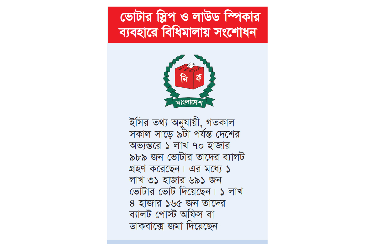 ভোটার স্লিপ ও লাউড স্পিকার ব্যবহারে বিধিমালায় সংশোধন : ত্রয়োদশ জাতীয় সংসদ নির্বাচন উপলক্ষে ভোটার স্লিপ ও লাউড স্পিকার ব্যবহারের বিষয়ে পরিবর্তন এনে রাজনৈতিক দল ও প্রার্থীর আচরণ বিধিমালায় ২০২৫- এর অধিকতর সংশোধন করেছে নির্বাচন কমিশন (ইসি)। সম্প্রতি ইসি সচিবালয়ের সিনিয়র সচিব আখতার আহমেদ স্বাক্ষরিত এ- সংক্রান্ত প্রজ্ঞাপন জারি করা হয়েছে। প্রজ্ঞাপনে বলা হয়েছে, সংসদ নির্বাচনে রাজনৈতিক দল ও প্রার্থীর আচরণ বিধিমালা, ২০২৫- এর অধিকতর সংশোধন করা হয়েছে।