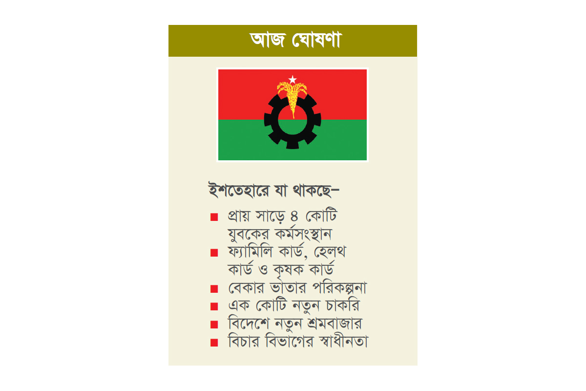 ত্রয়োদশ সংসদ নির্বাচনকে সামনে রেখে বিএনপি আজ শুক্রবার নির্বাচনি ইশতেহার ঘোষণা করবে। ইশতেহারে দলটির ঘোষিত ৩১ দফা, জুলাই সনদ এবং তরুণ ভোটারের আকাঙ্ক্ষাকে সর্বোচ্চ গুরুত্ব দেওয়া হচ্ছে। এতে ফ্যামিলি কার্ড, হেলথ কার্ড ও কৃষক কার্ডের মতো জনমুখী এবং জীবনঘনিষ্ঠ সেবার বিষয়গুলো বিশেষ জায়গা পাবে। এছাড়া গণতন্ত্র পুনরুদ্ধার, বিচার বিভাগের স্বাধীনতা, প্রশাসন বিকেন্দ্রীকরণ, মানবাধিকার রক্ষা, দুর্নীতিবিরোধী কাঠামো শক্তিশালীকরণের পাশাপাশি অর্থনীতি এবং পররাষ্ট্রনীতির ক্ষেত্রে বিশেষ প্রতিশ্রুতি দেওয়া হবে। আলেমণ্ডওলামা, সংখ্যালঘু, কৃষকের জন্য বিশেষ অগ্রাধিকারের প্রতিশ্রুতিও থাকবে বলে জানা গেছে। বিএনপির ইশতেহার আজ শুক্রবার ঘোষণা করা হবে বলে জানিয়েছেন দলের সিনিয়র যুগ্ম মহাসচিব রুহুল কবির রিজভী। গতকাল বৃহস্পতিবার যৌথসভা শেষে রাজধানীর নয়াপল্টনে বিএনপির কেন্দ্রীয় কার্যালয়ে সংবাদ সম্মেলনে এ কথা জানান তিনি।
