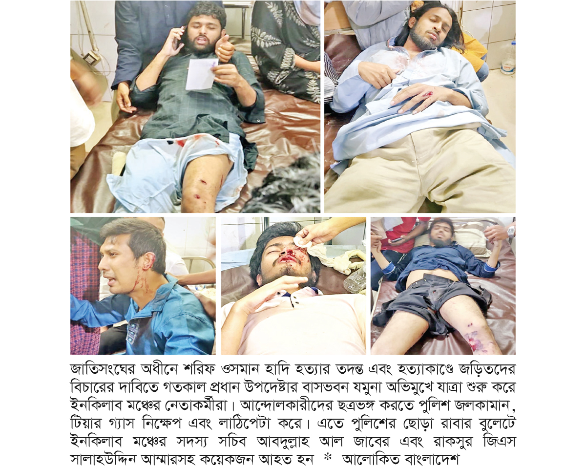 হাদি হত্যাকাণ্ডের তদন্ত ও হত্যায় জড়িতদের বিচারের দাবিতে প্রধান উপদেষ্টার বাসভবন যমুনা অভিমুখে যাত্রা করার সময় ইনকিলাব মঞ্চের নেতাকর্মীদের ছত্রভঙ্গ করে পুলিশ। এতে সংগঠনটির অন্তত ২৩ জন আহত হয়েছেন। শুক্রবার বিকেল ৩টা ৫০ মিনিটের দিকে শাহবাগের ইন্টারকন্টিনেন্টাল মোড় থেকে পুলিশের ব্যারিকেড ভেঙে যমুনা অভিমুখে যেতে চাইলে ইনকিলাব মঞ্চের নেতাকর্মীদের বাধা দেয় পুলিশ। আন্দোলনকারীদের ছত্রভঙ্গ করতে পুলিশ জলকামান ও টিয়ারগ্যাস ব্যবহার করে। আহতরা হলেন- আম্মার, আব্দুল্লাহ আল জাবের, ঝুমা, মনির, ফয়সাল, জয়, জুলকার, মোশাররফ, নিলয়, অনিক, উমর, রাহাত, রাসেল, আহাদ, মাহিন, আজাদ, শামিম, সোহেল, শাওন, জাবেদ, ঝুমা, আম্মাদ এবং শামিম। তারা ঢাকা মেডিকেল কলেজ (ঢামেক) হাসপাতালের জরুরি বিভাগে চিকিৎসা নেন। ঢামেকের ইমার্জেন্সি মেডিকেল অফিসার ইমরান হোসেন বলেন, এখন পর্যন্ত ২০-২৫ জন এসেছে। তাদের সবাই আহত। তবে, গুলিবিদ্ধ বা রাবার বুলেটে বিদ্ধ কেউ এসেছে কি না, সেটা এখনই বলতে পারব না। ভর্তি ছাড়াই অনেককে চিকিৎসাসেবা দেওয়া হচ্ছে।