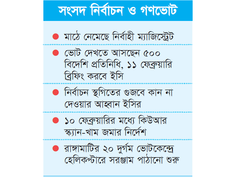 রাঙ্গামাটির ২০ দুর্গম ভোটকেন্দ্রে হেলিকপ্টারে সরঞ্জাম পাঠানো শুরু : রাঙ্গামাটির দুর্গম ২০টি ভোটকেন্দ্রে হেলিকপ্টারে নির্বাচনী সরঞ্জাম ও জনবল পাঠানোর কার্যক্রম শুরু হয়েছে। ভৌগোলিক দুর্গমতা এবং সড়ক-নৌপথে যোগাযোগের অপ্রতুলতার কারণে নির্বাচন কমিশন এসব কেন্দ্রকে ‘হেলিসর্টি ভোটকেন্দ্র’ হিসেবে চিহ্নিত করে বিশেষ এ ব্যবস্থা নিয়েছে। গতকাল শনিবার থেকে এই কার্যক্রম শুরু হয় এবং আগামী ১০ ফেব্রুয়ারি পর্যন্ত কয়েক ধাপে তা সম্পন্ন করা হবে।