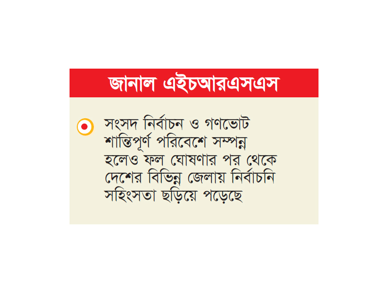 ত্রয়োদশ জাতীয় সংসদ নির্বাচন ও গণভোট শান্তিপূর্ণ পরিবেশে সম্পন্ন হলেও ফল ঘোষণার পর থেকে দেশের বিভিন্ন জেলায় নির্বাচনি সহিংসতা ছড়িয়ে পড়েছে। এসব ঘটনায় মুন্সিগঞ্জ ও বাগেরহাটে দুই যুবক এবং ময়মনসিংহের হালুয়াঘাটে এক শিশু নিহত হওয়ার খবর পাওয়া গেছে। এছাড়া অন্তত ৩০টি জেলায় দুই শতাধিক পৃথক সংঘর্ষে তিন শতাধিক মানুষ আহত হয়েছেন। ভাঙচুর ও অগ্নিসংযোগ করা হয়েছে অন্তত ৩৫০টি অফিস, ব্যবসা প্রতিষ্ঠান ও ঘরবাড়িতে। গতকাল রোববার রাজধানীর জাতীয় প্রেসক্লাবে হিউম্যান রাইটস সাপোর্ট সোসাইটি (এইচআরএসএস) আয়োজিত এক সংবাদ সম্মেলনে এসব তথ্য জানানো হয়। সংগঠনের নির্বাহী পরিচালক ইজাজুল ইসলাম লিখিত বক্তব্যে এসব সহিংসতা বন্ধে রাজনৈতিক দলগুলোকে কঠোর পদক্ষেপ নেওয়ার আহ্বান জানান।