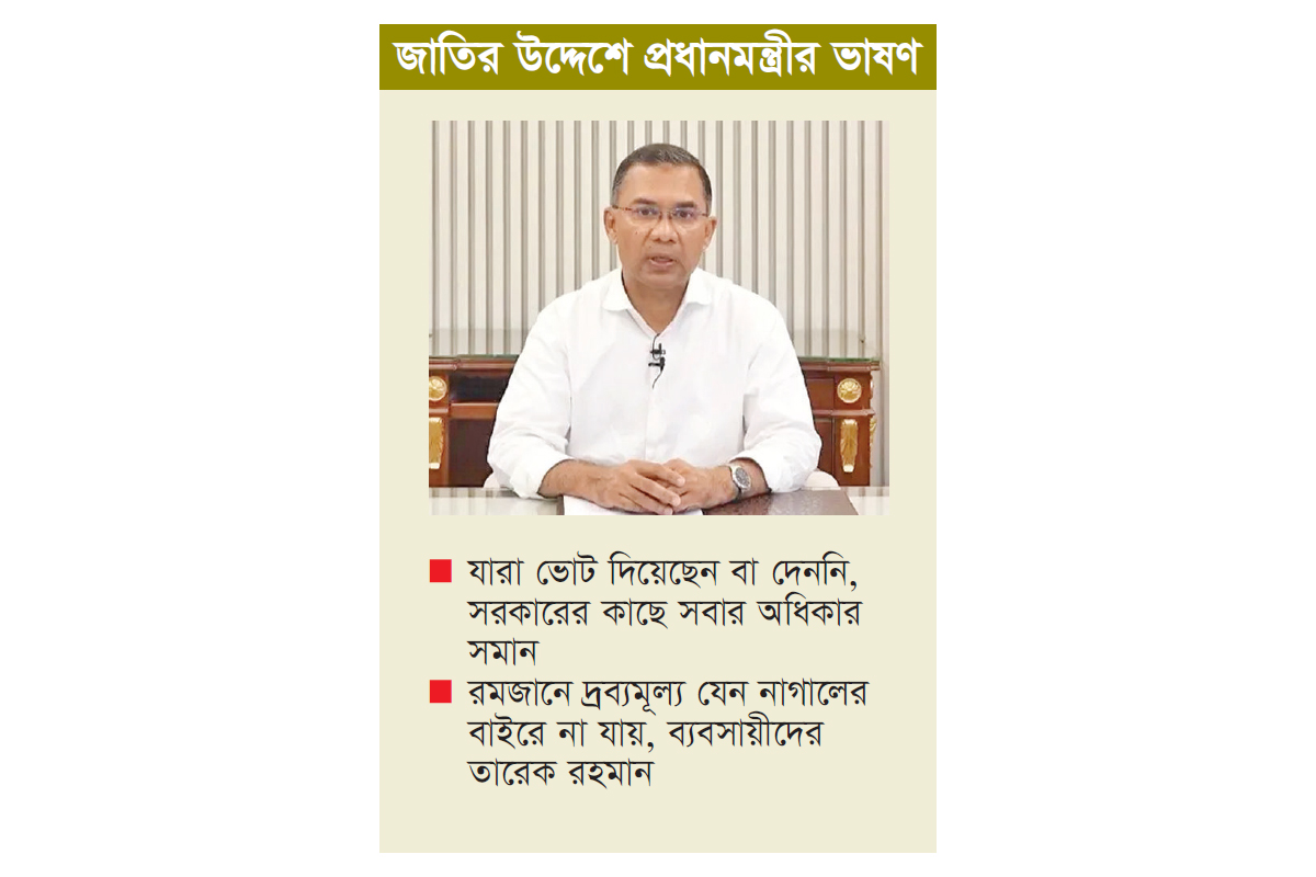 তারেক রহমান বলেন, সারাদেশে জুয়া এবং মাদকের বিস্তারকেও বর্তমান সরকার আইনশৃঙ্খলা অবনতির অন্যতম কারণ বলে চিহ্নিত করেছে। সুতরাং, জুয়া এবং মাদক নিয়ন্ত্রণে আইনশৃঙ্খলাবাহিনী সবরকমের কঠোর পদক্ষেপ নিচ্ছে। জনজীবনে শান্তি ও নিরাপত্তা নিশ্চিত করতে সরকার সর্বোচ্চ উদ্যোগ নিয়েছে। দেশের প্রতিটি সাংবিধানিক এবং সরকারি বেসরকারি প্রতিষ্ঠান চলবে বিধিবদ্ধ নীতি নিয়মে। দলীয় কিংবা রাজনৈতিক প্রভাব প্রতিপত্তি অথবা জোর জবরদস্তি নয়, আইনের শাসনই হবে রাষ্ট্র পরিচালনার শেষ কথা। তিনি আরও বলেন, আগামীকাল (বৃহস্পতিবার) থেকেই সারাদেশে শুরু হতে যাচ্ছে পবিত্র মাহে রমজান। দেশবাসীকে পবিত্র মাহে রমজানের শুভেচ্ছা জানাই। রমজান আত্মশুদ্ধির মাস। আমরা যদি আত্মশুদ্ধি শব্দটির মর্মার্থ উপলব্ধি করি তাহলে এই মাসে মানুষের ভোগান্তি বাড়ার কথা নয়। যদিও আমাদের অনেকের মধ্যেই এই মাসটিকে ঘিরে ব্যবসায় অধিক মুনাফা লাভের প্রবণতা লক্ষ্যণীয়। আপনাদের প্রতি আমার আহ্বান- রমজানের পবিত্রতা রক্ষার স্বার্থে এই মাসটিকে আপনারা ব্যাবসায় মুনাফা লাভের মাস হিসেবে পরিগণিত করবেন না। দ্রব্যমূল্য যাতে সাধারণ মানুষের নাগালের বাইরে না যায়, এ ব্যাপারে ব্যবসায়ীরা সতর্ক থাকবেন। হাজারও প্রাণের বিনিময়ে একটি মাফিয়া সিন্ডিকেটের পতন ঘটিয়ে, রাষ্ট্র এবং সরকারের জনগণের অধিকার প্রতিষ্ঠার অঙ্গীকার নিয়েই আমরা রাষ্ট্র পরিচালনার দায়িত্ব নিয়েছি। বিএনপি সরকার সবক্ষেত্রেই অনাচার, অনিয়মের সব সিন্ডিকেটে ভেঙে দিতে বদ্ধ পরিকর। ইনশাআল্লাহ।