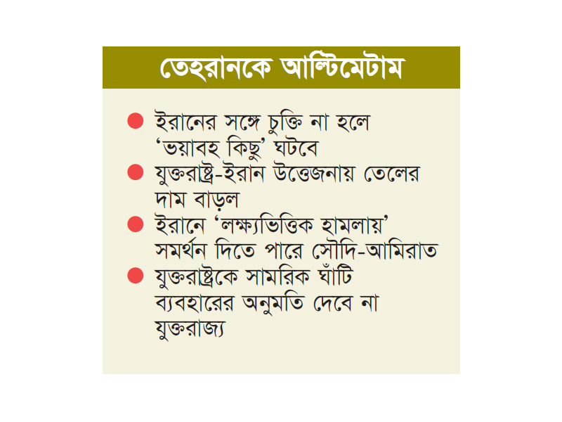 বৃহস্পতিবার ওয়াশিংটনে এক অনুষ্ঠানে ট্রাম্প সম্ভাব্য পদক্ষেপ নিয়ে দ্ব্যর্থক মন্তব্য করেন। তিনি বলেন, ‘হয়তো আমরা একটি চুক্তি করবো, হয়তো করবো না। আগামী ১০ দিনের মধ্যে হয়তো আপনারা জানতে পারবেন।’ পরে তিনি সময়সীমা ‘সর্বোচ্চ ১০ থেকে ১৫ দিন’ বলে উল্লেখ করেন। এর মধ্যেই বুধবার হোয়াইট হাউজের সিচুয়েশন রুমে ট্রাম্পের শীর্ষ জাতীয় নিরাপত্তা উপদেষ্টারা বৈঠক করেছেন। বিষয়টি সম্পর্কে অবগত এক মার্কিন কর্মকর্তা জানান, মার্চের মাঝামাঝি সময়ের মধ্যে অঞ্চলে পাঠানো সব মার্কিন বাহিনী অবস্থান নেবে।