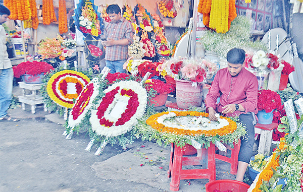 অমর একুশে ফেব্রুয়ারি, মহান শহীদ ও আন্তর্জাতিক মাতৃভাষা দিবসে শহীদ মিনারে ফুল দিয়ে শ্রদ্ধা জানাবেন সর্বস্তরের মানুষ। তাই শাহবাগে ফুলের দোকানগুলোতে তৈরি করা হচ্ছে পুষ্পস্তবক। গতকাল তোলা ছবি * আলোকিত বাংলাদেশ