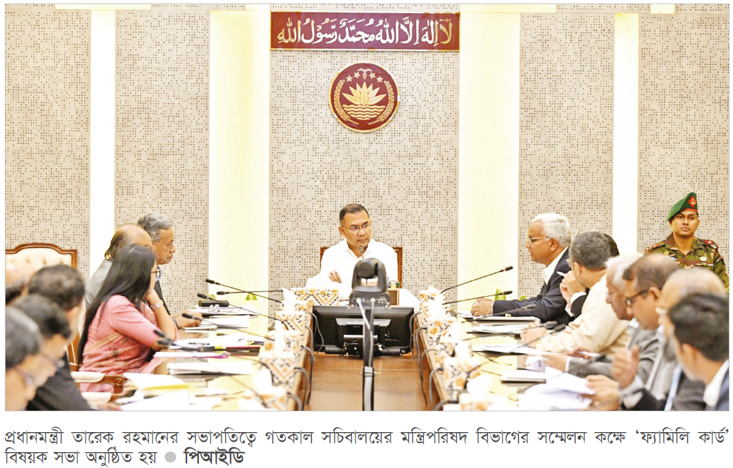আগামী ১০ মার্চ ফ্যামিলি কার্ড বিতরণের পরীক্ষামূলক কার্যক্রম প্রধানমন্ত্রী উদ্বোধন করবেন বলে জানিয়েছেন সমাজকল্যাণমন্ত্রী আবু জাফর মোহাম্মদ জাহিদ হোসেন। প্রাথমিকভাবে ১৪টি উপজেলায় একটি ইউনিয়নের একটি ওয়ার্ডের হতদরিদ্র, দরিদ্র ও নিম্নবিত্ত নারীরা ফ্যামিলি কার্ড পাবেন। এ কার্ডের আওতায় প্রত্যেক পরিবারকে ২ হাজার ৫০০ টাকা করে দেওয়া হবে বলেও জানিয়েছেন মন্ত্রী। গতকাল মঙ্গলবার সচিবালয়ে ফ্যামিলি কার্ড নিয়ে বৈঠক শেষে সাংবাদিকদের এ তথ্য জানান মন্ত্রী। সভায় সভাপতিত্ব করেন প্রধানমন্ত্রী তারেক রহমান। মন্ত্রী বলেন, ‘মন্ত্রিসভা কমিটির সুপারিশের আলোকে আজ প্রধানমন্ত্রীর সভাপতিত্বে ফ্যামিলি কার্ড বিষয়ে পাইলটিংয়ের একটা চূড়ান্ত সিদ্ধান্ত হয়েছে। আমরা আগামী ১০ মার্চ ইনশাআল্লাহ প্রধানমন্ত্রী পাইলটিংয়ের যে কার্যক্রম অর্থাৎ ফ্যামিলি কার্ড বিতরণের সেটি উদ্বোধন করবেন। আমরা এই মুহূর্তে বাংলাদেশের ১৪টি উপজেলাকে চুজ করেছি বাংলাদেশের বিভিন্ন বিভাগ হিসাব করে। সেই ১৪টি জেলা ও উপজেলার মধ্যে থেকে একটা ইউনিয়নের একটা ওয়ার্ডকে আমরা ইউনিভার্সালি ফ্যামিলি কার্ড বিতরণ করা হবে এবং সেটার উদ্বোধন করবেন প্রধানমন্ত্রী ইনশাআল্লাহ আগামী ১০ মার্চ বিফোর ঈদুল ফিতর।’ তিনি বলেন, ‘এটা বাংলাদেশে একযোগে ওইদিন ১৪টি উপজেলার এই কার্যক্রমটার সূচনা করা হবে এবং এটা কন্টিনিউয়াসলি চলবে। এই কার্যক্রম গ্র্যাজুয়ালি সারাদেশে ছড়িয়ে দেওয়া হবে। এটার মাধ্যমে ইনশাআল্লাহ একটি সময় বাংলাদেশের যারা হতদরিদ্র বলি বা দরিদ্র এবং নিম্নবিত্ত- এই তিন শ্রেণির আমাদের যে মায়েরা আছেন, একটা পরিবারের যে মা প্রধান সেই পরিবার এ সুবিধা পাবে। এর মাধ্যমে আমরা মনে করি যে নারীর ক্ষমতায়ন এবং নারীকে অর্থনৈতিকভাবে স্বাবলম্বী করে গড়ে তোলা এবং নারী যদি অর্থনৈতিকভাবে স্বাবলম্বী হয় তো পরিবার স্বাবলম্বী হবে, আগামী প্রজন্ম এ থেকে স্বাবলম্বী হবে বলে আমরা বিশ্বাস করি।’