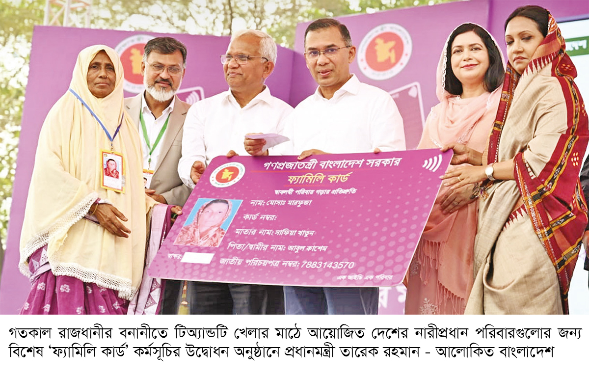 দেশের ৩৭ হাজার পরিবারের প্রধান নারীর হাতে তুলে দেওয়া হলো ‘ফ্যামিলি কার্ড’। পর্যায়ক্রমে সারা দেশের চার কোটি পরিবারের কাছে এই কার্ড পৌঁছে দেবে সরকার। এর সঙ্গে আগামী মাস থেকে কৃষকদের মধ্যে ‘কৃষক কার্ড’ বিতরণ শুরু হবে বলে ঘোষণা দিয়েছেন প্রধানমন্ত্রী তারেক রহমান। গতকাল মঙ্গলবার সকালে রাজধানীর বনানীতে কড়াইল বস্তিসংলগ্ন টিঅ্যান্ডটি মাঠে ‘ফ্যামিলি কার্ড’ কর্মসূচির উদ্বোধনী অনুষ্ঠানে প্রধান অতিথির বক্তব্যে প্রধানমন্ত্রী এসব কথা জানান। পাইলট প্রকল্পের অংশ হিসেবে সারা দেশের ১৪টি স্থানে একযোগে এই কার্ড বিতরণ শুরু হয়। এর মধ্যে রাজধানীর কড়াইল, সাততলা বস্তি ও ভাষানটেক বস্তি এলাকার ১৫ হাজার নারী ফ্যামিলি কার্ড পেয়েছেন। অনুষ্ঠানের শুরুতে পবিত্র কোরআন, বেদ, ত্রিপিটক, বাইবেল পাঠের পর বিএনপি দলীয় সংগীত পরিবেশ করা হয়। অনুষ্ঠানে ফ্যামিলি কার্ডের ওপর একটি প্রামাণ্যচিত্র প্রদর্শন করা হয়। প্রধান অতিথির আগে সমাজকল্যাণ মন্ত্রী আবু জাফর মো. জাহিদ হোসেন বক্তব্য রাখেন। এরপর পরিবেশন করা হয় জাতীয় সংগীত। এ অনুষ্ঠানে ১৭ জন নারীর হাতে ‘ফ্যামিলি কার্ড’ তুলে দেন প্রধানমন্ত্রী তারেক রহমান। কার্ড তুলে দেওয়ার পরপরই সরকারপ্রধান ল্যাপটপে একটি বাটন প্রেস করেন, সঙ্গে সঙ্গে উপকারভোগীদের কাছে নগদ অর্থ চলে যায়। এ সময় করতালিতে মুখরিত হয়ে ওঠে অনুষ্ঠানস্থল।