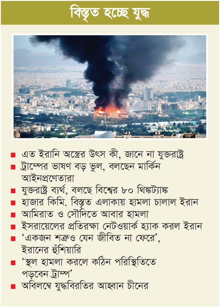 হাজার কিমি বিস্তৃত এলাকায় হামলা চালাল ইরান : মধ্যপ্রাচ্যজুড়ে মার্কিন এবং ইসরায়েলি অবস্থান লক্ষ্য করে ব্যাপক হামলা চালিয়েছে ইরানের ইসলামি বিপ্লবী গার্ড বাহিনী বা আইআরজিসি। বুধবার সকালে শুরু হওয়া ‘অপারেশন ট্রু প্রমিজ-ফোর’-এর ৮৯তম ধাপের এই অভিযানে শতাধিক ভারী ক্ষেপণাস্ত্র, ২০০ রকেট এবং বিপুল সংখ্যক ড্রোন ব্যবহার করা হয়। কয়েক হাজার কিলোমিটার বিস্তৃত এলাকায় এই সমন্বিত হামলা চালানো হয়। আইআরজিসি-র জনসংযোগ বিভাগ জানিয়েছে, ইসরায়েলের ইলাত, তেল আবিব এবং বনি ব্রাক শহরের সামরিক লক্ষ্যবস্তুগুলোতে হামলা চালানো হয়েছে। স্থানীয় সূত্রের বরাতে আইআরজিসি বলেছে, এসব হামলায় ইসরায়েলি বাহিনী ব্যাপক ক্ষয়ক্ষতির সম্মুখীন হয়েছে। পাশাপাশি বাহরাইনে মার্কিন বাহিনীর একটি গোপন আস্তানা লক্ষ্য করে নিখুঁত হামলা চালানো হয়, যেখানে প্রায় ৮০ জন সেনাসদস্য অবস্থান করছিলেন। এছাড়া ইরাক সীমান্তের পাশে মরুভূমিতে অবস্থিত আল-উদাইরি ঘাঁটিতে ব্যালিস্টিক ক্ষেপণাস্ত্রের আঘাতে মার্কিন সেনাবাহিনীর একটি চিনুক হেলিকপ্টার সম্পূর্ণ ধ্বংস এবং বেশ কয়েকটি মারাত্মকভাবে ক্ষতিগ্রস্ত হয়েছে। অভিযানের অংশ হিসেবে পারস্য উপসাগর ও আরব সাগরে পাঁচটি পৃথক অভিযান চালিয়েছে ইরানি নৌবাহিনী। আইআরজিসি-র তথ্য অনুযায়ী, সংযুক্ত আরব আমিরাতের জলসীমায় থাকা দুটি মার্কিন আর্লি ওয়ার্নিং রাডার সিস্টেম ধ্বংস করা হয়েছে। পারস্য উপসাগরের মাঝখানে ‘অ্যাকুয়া ওয়ান’ নামের একটি ইসরায়েলি ট্যাঙ্কারে সফল হামলা চালানো হয়েছে, যা এখনও জ্বলছে। ভারত মহাসাগরে অবস্থানরত মার্কিন বিমানবাহী রণতরী ‘ইউএসএস আব্রাহাম লিংকন’-কে লক্ষ্য করে ড্রোন হামলা চালানো হলে সেটি অবস্থান পরিবর্তন করে গভীর সমুদ্রে পিছু হটতে বাধ্য হয়। আমিরাতে মার্কিন কর্মকর্তাদের একটি গোপন জমায়েতে মঙ্গলবারের হামলায় অন্তত ৩৭ জন নিহত হওয়ার খবর নিশ্চিত করেছে ইরান। আইআরজিসি তাদের বিবৃতিতে উল্লেখ করেছে, এই যুদ্ধ মুসলিম উম্মাহকে ঐক্যবদ্ধ করেছে। এই সংঘাতের ফলে ইসরায়েলের জীবনযাত্রা স্থবির হয়ে পড়েছে এবং যুক্তরাষ্ট্রে চিকিৎসা ও খাদ্য সরবরাহ ব্যবস্থা বিঘ্নিত হচ্ছে। হরমুজ প্রণালী সম্পর্কে আইআরজিসি কড়া হুঁশিয়ারি দিয়ে জানিয়েছে, এই গুরুত্বপূর্ণ জলপথটি সম্পূর্ণ তাদের নিয়ন্ত্রণে রয়েছে এবং শত্রুভাবাপন্ন কোনো শক্তির জন্য এটি খোলা হবে না।