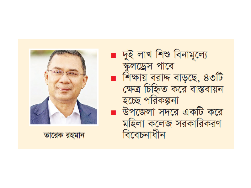 শিক্ষায় বরাদ্দ বাড়ছে, ৪৩টি ক্ষেত্র চিহ্নিত করে বাস্তবায়ন হচ্ছে পরিকল্পনা - প্রধানমন্ত্রী : শিক্ষা খাতে ৪৩টি ক্ষেত্র চিহ্নিত করে স্বল্প, মধ্য ও দীর্ঘমেয়াদি পরিকল্পনা বাস্তবায়ন করা হচ্ছে বলে জানিয়েছেন প্রধানমন্ত্রী তারেক রহমান। পর্যায়ক্রমে দেশের সব উপজেলায় টেকনিক্যাল স্কুল ও কলেজ এবং সব জেলায় পলিটেকনিক ইনস্টিটউট স্থাপনের পরিকল্পনার কথাও জানান তিনি। গতকাল বুধবার জাতীয় সংসদে বিএনপির সংসদ সদস্য সেলিম রেজার এক প্রশ্নের জবাবে প্রধানমন্ত্রী এ তথ্য জানান। স্পিকার হাফিজ উদ্দিন আহমদের সভাপতিত্বে বৈঠকের শুরুতে প্রধানমন্ত্রীর জন্য নির্ধারিত প্রশ্নোত্তর টেবিলে উত্থাপন করা হয়।