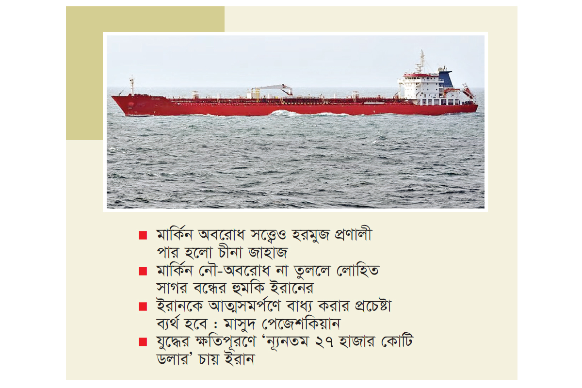 ইরানকে আত্মসমর্পণে বাধ্য করার প্রচেষ্টা ব্যর্থ হবে- মাসুদ পেজেশকিয়ান : ইরানকে আত্মসমর্পণ করতে বাধ্য করার জন্য যুক্তরাষ্ট্র ও ইসরায়েলের যেকোনো প্রচেষ্টা ‘ব্যর্থ হবে’ বলে মন্তব্য করেছেন দেশটির প্রেসিডেন্ট মাসুদ পেজেশকিয়ান। তিনি বলেছেন, ইরানের জনগণ এ ধরনের পদক্ষেপ কখনো মেনে নেবে না। বুধবার তেহরানে জরুরি পরিষেবা কর্মকর্তাদের সঙ্গে বৈঠকে পেজেশকিয়ান এসব কথা বলেন। তিনি আরও বলেছেন, তেহরান ‘যুদ্ধ বা অস্থিতিশীলতা নয়’, বরং সব সময়ই ‘গঠনমূলক আলোচনা’র পক্ষে। প্রেসিডেন্ট মাসুদ পেজেশকিয়ান এমন এক সময় এসব কথা বলেছেন যার কয়েক ঘণ্টা আগে মার্কিন প্রেসিডেন্ট ডোনাল্ড ট্রাম্প জানিয়েছেন যে, চলতি সপ্তাহেই পুনরায় শান্তি আলোচনা শুরু হতে পারে। তবে তেহরান এ বিষয়ে সরাসরি কোনো মন্তব্য করেনি। হরমুজ প্রণালি ঘিরে ওয়াশিংটন ও তেহরানের উত্তেজনা বেড়েই চলেছে। অবরোধ অব্যাহত রেখেই আগামী ৪৮ ঘণ্টার মধ্যে ফের ইরানের সঙ্গে আলোচনায় বসার কথা জানিয়েছেন ট্রাম্প। এদিকে ইরানি বন্দরগুলোতে মার্কিন নৌ-অবরোধের প্রথম দিন পাল্টাপাল্টি দাবি ও সন্দেহের মধ্য দিয়ে পেরিয়েছে। মার্কিন বাহিনী দাবি করেছে, তাদের কড়াকড়ির কারণে ওই পথ দিয়ে কোনো জাহাজ বের হতে পারেনি। যদিও বিবিসির অনুসন্ধানী তথ্যে দেখা গেছে ভিন্ন চিত্র। স্যাটেলাইটের ডাটা অনুযায়ী, অবরোধের মধ্যেই অন্তত চারটি জাহাজ হরমুজ প্রণালি অতিক্রম করেছে।