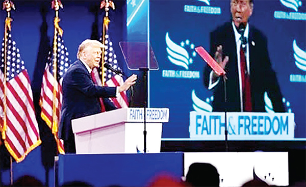 প্রাক্তন মার্কিন প্রেসিডেন্ট ডোনাল্ড ট্রাম্প গত শনিবার ইভাঞ্জেলিক্যাল খ্রিষ্টানদের প্রতি নভেম্বর মাসে তার পক্ষে গণভোট দেওয়ার আহ্বান জানিয়েছেন। তিনি নির্বাচিত হলে তাদের ধর্মীয় স্বাধীনতাকে ‘কঠোরভাবে’ সুরক্ষা করবেন বলে তার অঙ্গীকার ঘোষণা করেছেন। ইভাঞ্জেলিক্যাল খ্রিস্টান বাইবেলকে গুরুত্ব সহকারে নেয় এবং যিশু খ্রীষ্টকে ত্রাণকর্তা এবং প্রভু হিসাবে বিশ্বাস করে। প্রাক্তন নেতা ট্রাম্প নিজে খুব কমই গির্জায় উপস্থিত হন, তিনি ধর্মীয় অধিকারের ব্যাপারে প্রতিশ্রুতিবদ্ধ হয়েছেন। তিনি সুপ্রিমকোর্টের বিচারক নিয়োগ করে গর্ভপাতের ফেডারেল অধিকারকে উল্টে দিতে সাহায্য করেছিলেন। রক্ষণশীল অ্যাডভোকেসি গ্রুপ ফেইথ অ্যান্ড ফ্রিডম কোয়ালিশনের ওয়াশিংটন কনফারেন্সে ট্রাম্প শত শত সমর্থককে বলেছেন, ‘ইভাঞ্জেলিক্যালস এবং খ্রিষ্টানরা যতটা ভোট দেওয়া উচিত ততটা দেয় না।’ তিনি বলেন, ‘তারা প্রতি রোববার গির্জায় যায়, কিন্তু তারা ভোট দেয় না।’ মেয়াদের সীমাবদ্ধতার কারণে ট্রাম্প ২০২৮ সালে প্রেসিডেন্ট পদে প্রতিদ্বন্দ্বিতা করতে অযোগ্য হবেন। পিউ রিসার্চ সেন্টারের মতে, ট্রাম্পের ২০১৬ সালের বিজয়ের জন্য এবং আবার তার ২০২০ সালের ব্যর্থ প্রচারে ইভাঞ্জেলিক্যাল ভোটাররা গুরুত্বপূর্ণ ছিল, যখন ৮৪ শতাংশ শ্বেতাঙ্গ ধর্মপ্রচারক প্রোটেস্ট্যান্টরা তাকে ভোট দিয়েছিলেন। ট্রাম্প গত শনিবার তাদের স্বার্থ রক্ষার প্রতিশ্রুতি দিয়েছেন, কারণ তিনি ‘কঠোরভাবে’ ধর্মীয় স্বাধীনতা রক্ষার’ প্রতিশ্রতি দিয়েছেন। তিনি সমর্থকদের বলেন, ‘আমরা আমাদের স্কুলে, আমাদের সামরিক বাহিনীতে, আমাদের সরকারে, আমাদের কর্মক্ষেত্রে, আমাদের হাসপাতালে এবং আমাদের পাবলিক স্কোয়ারে খ্রিষ্টানদের রক্ষা করব।’ তিনি প্রবলভাবে ‘খ্রিষ্টানবিরোধী পক্ষপাতের বিরুদ্ধে লড়াইয়ের জন্য একটি নতুন ফেডারেল টাস্ক ফোর্স’ তৈরি করার প্রতিশ্রুতি দিয়েছেন যা মার্কিন খ্রিষ্টানদের ‘অবৈধ বৈষম্য, হয়রানি, নিপীড়ন’ তদন্ত করবে। মার্চ মাসে প্রকাশিত একটি পিউ রিসার্চ সমীক্ষা অনুসারে, প্রায় অর্ধেক (৪৯ শতাংশ) আমেরিকান বিশ্বাস করে যে, মার্কিন যুক্তরাষ্ট্রে ধর্মের প্রভাব হ্রাস পাচ্ছে এবং খ্রিষ্টান হিসাবে চিহ্নিত আমেরিকানদের সংখ্যা ১৯৯০-এর দশকে প্রায় ৯০ শতাংশ থেকে ২০২২ সালে জনসংখ্যার দুই-তৃতীয়াংশেরও কম হয়ে গেছে, বেশিরভাগই ধর্মীয়ভাবে যুক্ত নয় এমন লোকের সংখ্যা বৃদ্ধি পাচ্ছে। অনেক শ্বেতাঙ্গ ইভাঞ্জেলিক্যাল খ্রিষ্টানদের জন্য এটি একটি রক্ষণশীল সম্প্রদায় যারা মার্কিন ভোটারদের প্রায় ১৪ শতাংশ, এটি অত্যন্ত গুরুত্বপূর্ণ যে ধর্ম জনজীবনে প্রাসঙ্গিক থাকে। ট্রাম্প জনতাকে বলেছেন, রাজনৈতিক বামরা ‘আপনাকে নীরব করতে, আপনাকে 