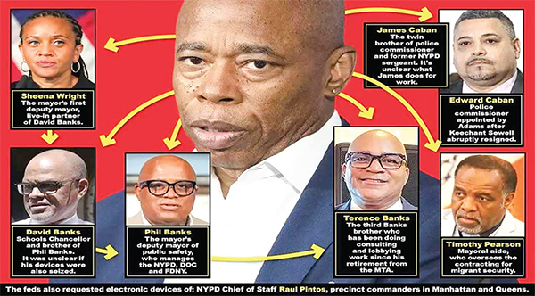 তারা জানায়, নিউ ইয়র্কের দক্ষিণ জেলার মার্কিন অ্যাটর্নি অফিসের একটি তদন্তের বিষয়ে পুলিশ বিভাগকে অবগত করা হয়েছে যে সেখানে দুর্নীতিতে জড়িত পরিষেবার সদস্যরা জড়িত। গত বৃহস্পতিবার মেয়র এরিক অ্যাডামসের নিয়োগ করা ডেপুটি মেয়র শিনা রাইট এবং ডেপুটি মেয়র ফিলিপ ব্যাঙ্কসসহ নিউইয়র্কের শীর্ষস্থানীয় কয়েকজন কর্মকর্তার বাড়িতে অভিযান চালানো হয়েছে। এর আগে এসব কর্মকর্তা দুর্নীতির অভিযোগে তদন্তের মুখোমুখি হয়েছেন। নিউইয়র্ক সিটি হলের একজন আইনজীবী জানান, মেয়রের অফিসে কেউ তদন্তের লক্ষ্যবস্তু হতে পারে, আগে থেকে এমন কোনো ইঙ্গিত দেননি তদন্তকারীরা। তবে, অভিযানে অংশ নেয়া মার্কিন অ্যাটর্নি অফিস এবং মার্কিন যুক্তরাষ্ট্রের কেন্দ্রীয় গোয়েন্দা সংস্থা (এফবিআই) এ বিষয়ে মন্তব্য করতে অস্বীকৃতি জানিয়েছে। গত বৃহস্পতিবার সন্ধ্যা পর্যন্ত অভিযানের বিষয়ে কোনো আনুষ্ঠানিক কারণ জানানো হয়নি। বিবিসির মার্কিন অংশীদার সিবিএস নিউজকে জানিয়েছে, নিউইয়র্ক পুলিশ বিভাগের নির্বাহীদের ইলেকট্রনিক ডিভাইস সংক্রান্ত তদন্তের জন্য অন্তত একটি অভিযান পরিচালনা করা হয়েছে। কর্মকর্তাদের বাড়ি তল্লাশির সময় ডেপুটি মেয়র শিনা রাইট এবং জননিরাপত্তার জন্য ডেপুটি মেয়র ফিলিপ ব্যাঙ্কসের মোবাইল ফোন জব্দ করা হয়েছে বলে জানা গেছে। নিউইয়র্ক পুলিশ বিভাগের কমিশনার এডওয়ার্ড ক্যাবান ২০২৩ সাল থেকে নিউইয়র্ক পুলিশ বিভাগের নেতৃত্ব দিচ্ছেন। তিনি নিউইয়র্ক সিটির প্রথম ল্যাটিনো পুলিশ কমিশনার এবং মেয়র অ্যাডামসের ঘনিষ্ঠ সহযোগী হিসেবে বিবেচিত। সিটি হলের প্রধান আইনি পরামর্শদাতা লিসা জর্নবার্গ বিবিসিকে বলেছেন, তদন্তকারীরা অ্যাডামসের অফিসে অভিযান চালানোর কোনো প্রকার আগাম ইঙ্গিত দেয়নি। তারা কোনো ভাবে বুঝতেই দেননি যে মেয়র বা তার কর্মীরা কোনো তদন্তের লক্ষ্যবস্তু। আইন প্রয়োগকারীর সাবেক সদস্য হিসেবে মেয়র বারবার স্পষ্ট করেছেন দলের সব সদস্যকে আইন অনুসরণ করতে হবে। এর আগে আইনি সমস্যার সম্মুখীন হয়েছেন প্রাক্তন নিউইয়র্ক পুলিশ বিভাগের প্রধান ফিল ব্যাঙ্কস। বিগত মেয়র প্রশাসনের সময় একটি পুলিশ প্রকল্পে ঘুষ দেয়া এবং ষড়যন্ত্রকারী হিসাবে তাকে চিহ্নিত করেছিল ফেডারেল প্রসিকিউটররা। ২০১৪ সালে ব্যাঙ্কস পুলিশ বিভাগ ছেড়ে চলে যায় এবং তারপর তাকে কখনোই কোনো অপরাধে জন্য অভিযুক্ত করা হয়নি। মেয়র হিসেবে এরিক অ্যাডামসের দায়িত্ব নেয়ার পর থেকে আইন প্রয়োগকারী তদন্তসংস্থার নজরদারীতে রয়েছে। গত বছর অ্যাডামসের প্রধান তহবিল সংগ্রহকারী ব্রায়ানা সুগসের বাড়িতে অভিযান চালায় এফবিআই। তুর্কি সরকার এবং অন্য বিদেশি উৎস থেকে অবৈধ প্রচারাভিযানের জন্য অনুদান পেয়েছে কি না তা খতিয