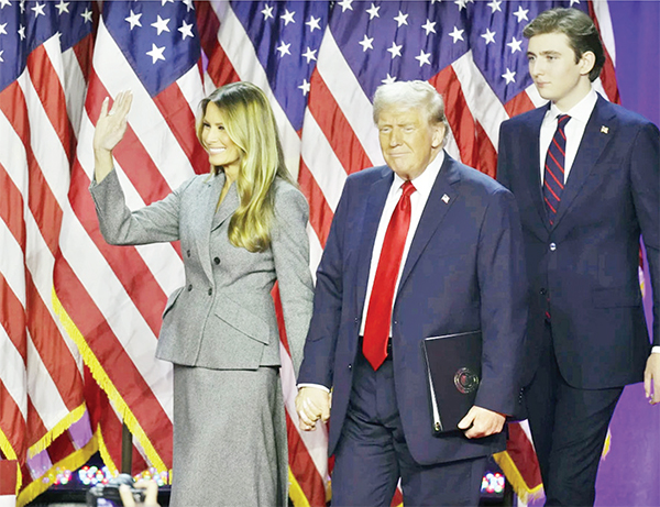 মার্কিন যুক্তরাষ্ট্রের ৪৭তম প্রেসিডেন্ট নির্বাচনে ম্যাজিক ফিগার ২৭০ ইলেক্টোরাল কলেজ ভোট থেকে মাত্র ৩ ভোট দূরে আছেন রিপাবলিকান দলীয় প্রার্থী ডোনাল্ড ট্রাম্প। গতকাল বুধবার ফ্লোরিডার ওয়েস্ট পাম বিচে রিপাবলিকান পার্টির প্রধান কার্যালয়ে দলীয় কর্মী-সমর্থকদের উদ্দেশে নির্বাচনে বিজয়ী ভাষণ দিয়েছেন তিনি। সেখানে দেয়া ভাষণে নির্বাচনি জয়কে ‘রাজনৈতিক বিজয়’ বলে মন্তব্য করেছেন তিনি। এসময় মঞ্চে পাশে দাঁড়ানো স্ত্রী মেলানিয়া ট্রাম্পকে জড়িয়ে আবেগাপ্লুত হয়ে যান ডোনাল্ড ট্রাম্প। ডায়েসে ফিরে মেলানিয়াকে ফার্স্ট লেডি বলে সম্বোধন করে ধন্যবাদ জানান তিনি। একই সঙ্গে মেলানিয়া ট্রাম্পের লেখা বইয়ের প্রশংসা করে ট্রাম্প বলেন, দেশের সবচেয়ে বেশি বিক্রিত বই রয়েছে তার। ডোনাল্ড ট্রাম্প বলেন, তিনি (মেলানিয়া) দুর্দান্ত কাজ করেছেন। মানুষকে সাহায্য করার জন্য অত্যন্ত কঠোর পরিশ্রম করেন তিনি। এ সময় নিজের সন্তানদেরও ধন্যবাদ জানান ডোনাল্ড ট্রাম্প। প্রত্যেক সন্তানের নাম উল্লেখ করে তারা আমার চমৎকার সন্তান। ট্রাম্পের ভাষণের সময় পাম বিচের জড়ো হওয়া জনতা ‘আমেরিকা’, ‘আমেরিকা’ স্লোগান দেন। সমর্থকদের উদ্দেশে ট্রাম্প বলেন, ‘প্রত্যেক দিন আমি আপনারদের জন্য লড়াই করে যাব।’ গত জুলাইয়ে নির্বাচনি প্রচারণার সময় গুপ্তহত্যার চেষ্টা থেকে বেঁচে যাওয়ার বিষয়ে তিনি বলেন, আমি একটি মাত্র কারণে গুপ্তহত্যার চেষ্টা থেকে বেঁচে গিয়েছি। জনতাকে তিনি বলেন, ‘তার জীবন একটি কারণে রক্ষা পেয়েছে, সেটি হলো দেশকে রক্ষা করা।’ ট্রাম্প বলেন, তিনি হোয়াইট হাউজে প্রত্যেকের জন্য লড়াই করবেন। যুক্তরাষ্ট্রের প্রেসিডেন্ট হওয়া বিশ্বের সবচেয়ে গুরুত্বপূর্ণ কাজ। প্রতিশ্রুতি দেয়া এবং রক্ষা করাই হবে তার সরকার পরিচালনার মূলনীতি বলেও ঘোষণা দেন তিনি। মার্কিন সংবাদমাধ্যম এপি বলছে, নির্বাচনে জয়ের জন্য ৫৩৮টি ইলেক্টোরাল কলেজ ভোটের মধ্যে ২৭০টির প্রয়োজন হলেও ডোনাল্ড এখন পর্যন্ত ২৬৭টি ভোট পেয়েছেন। আর তার প্রতিদ্বন্দ্বী প্রার্থী কমালা হ্যারিস পেয়েছেন ২২৪টি ভোট।