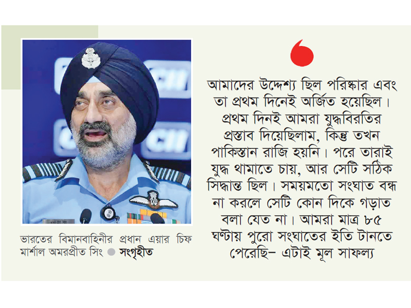 অমরপ্রীত সিং দাবি করেন, ‘আমাদের উদ্দেশ্য ছিল পরিষ্কার এবং তা প্রথম দিনেই অর্জিত হয়েছিল। প্রথম দিনই আমরা যুদ্ধবিরতির প্রস্তাব দিয়েছিলাম, কিন্তু তখন পাকিস্তান রাজি হয়নি। পরে তারাই যুদ্ধ থামাতে চায়, আর সেটি সঠিক সিদ্ধান্ত ছিল। সময়মতো সংঘাত বন্ধ না করলে সেটি কোন দিকে গড়াত বলা যেত না। আমরা মাত্র ৮৫ ঘণ্টায় পুরো সংঘাতের ইতি টানতে পেরেছি- এটাই মূল সাফল্য।’