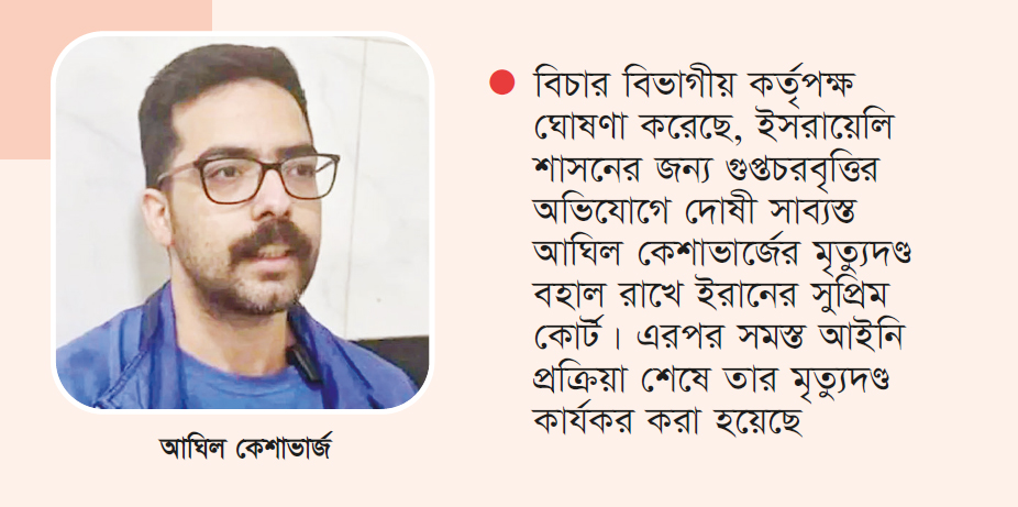 গতকাল শনিবার ইরানের আধা-সরকারি সংবাদ সংস্থা মেহেরের প্রতিবেদনে এ তথ্য তুলে ধরা হয়। বিচার বিভাগীয় কর্তৃপক্ষ ঘোষণা করেছে, ইসরায়েলি শাসনের জন্য গুপ্তচরবৃত্তির অভিযোগে দোষী সাব্যস্ত আঘিল কেশাভার্জের মৃত্যুদণ্ড বহাল রাখে ইরানের সুপ্রিম কোর্ট। এরপর সমস্ত আইনি প্রক্রিয়া শেষে তার মৃত্যুদণ্ড কার্যকর করা হয়েছে।