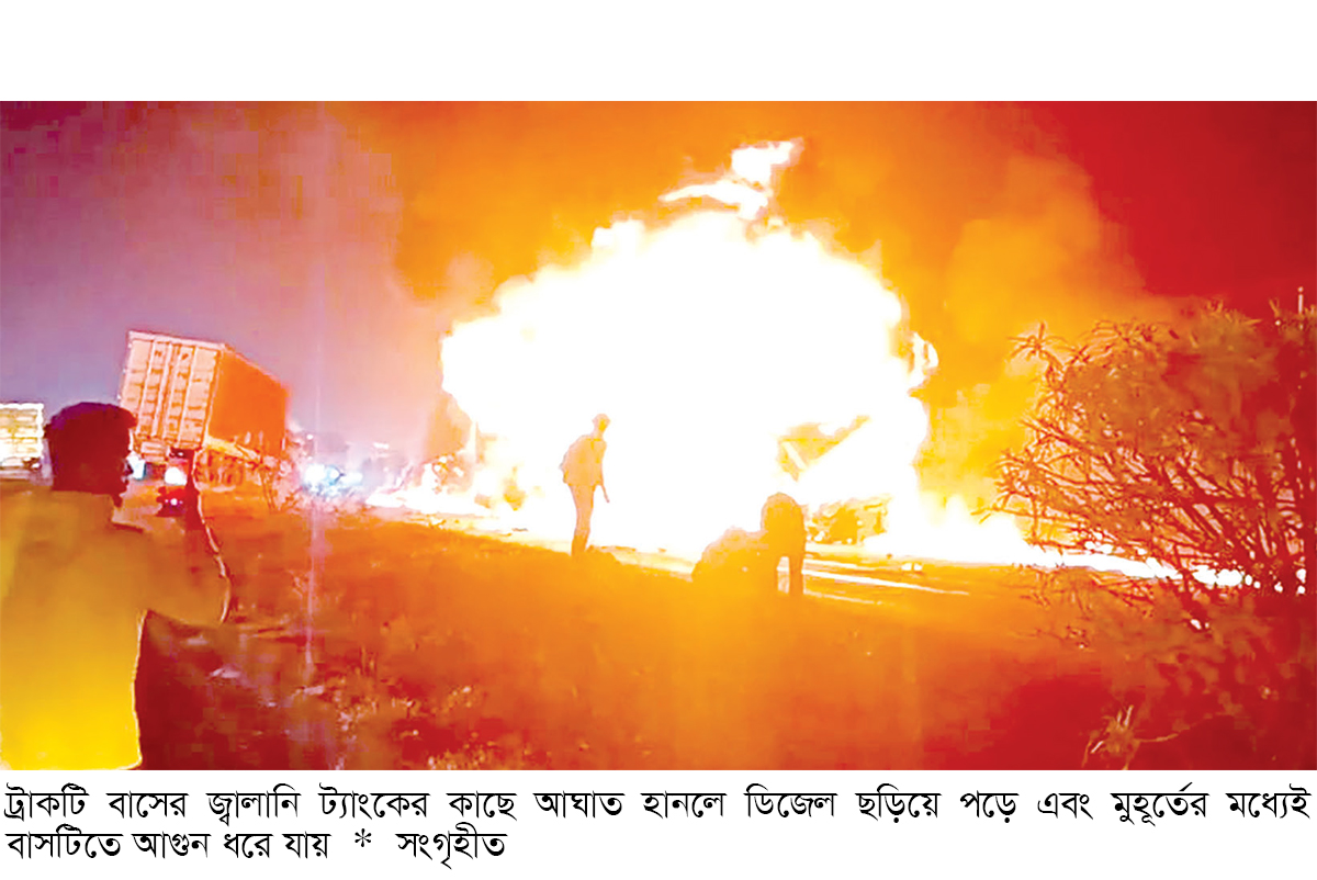 প্রাথমিকভাবে ধারণা করা হচ্ছে, ট্রাকটি বাসের জ্বালানি ট্যাংকে আঘাত করায় দ্রুত আগুন ছড়িয়ে পড়ে। দুর্ঘটনাকবলিত বাসটি সিবার্ড কোচ কোম্পানির ছিল। এতে চালক ও কন্ডাক্টরসহ মোট ৩২ জন আরোহী ছিলেন। সংঘর্ষের পর বাসটি পুরোপুরি আগুনে পুড়ে যায়। ঘটনাস্থলে থাকা প্রত্যক্ষদর্শী সচিন বলেন, ‘সিবার্ড বাসটি আমাদের গাড়ি ওভারটেক করেছিল। ঠিক তখনই বিপরীত দিক থেকে আসা একটি কনটেইনার ট্রাক ডিভাইডার টপকে এসে স্লিপার বাসটির সঙ্গে ধাক্কা খায়। সংঘর্ষটি হয় বাসের ডিজেল ট্যাংকের কাছেই।’
