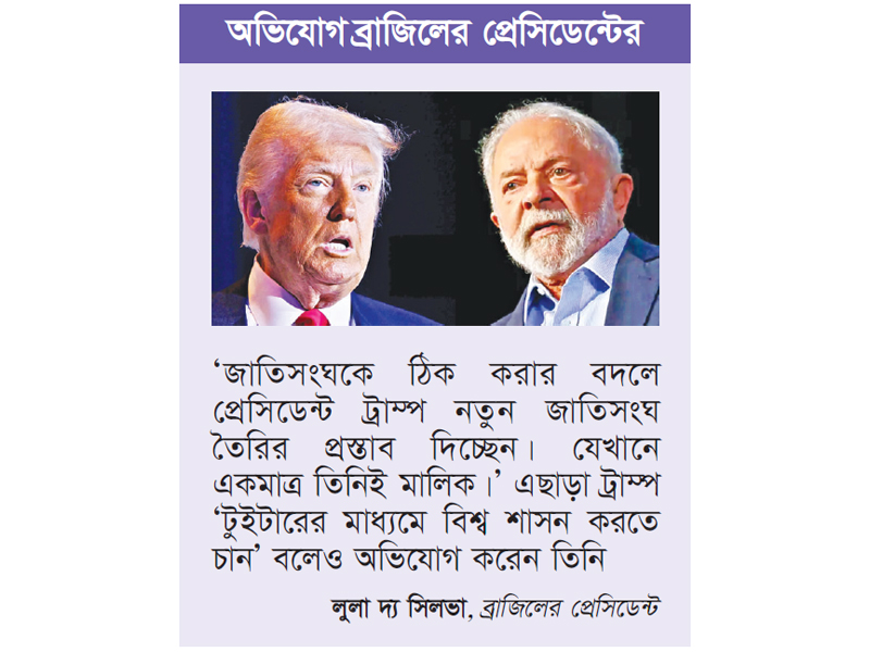 যুক্তরাষ্ট্রের প্রেসিডেন্ট নতুন জাতিসংঘ তৈরির চেষ্টা করছেন বলে অভিযোগ করেছেন ব্রাজিলের প্রেসিডেন্ট লুলা দ্য সিলভা। দুদিন আগে সুইজারল্যান্ডের দাভোসে ‘বোর্ড অব পিস’ নামে একটি সংস্থার যাত্রা শুরু করেন ট্রাম্প। সেখানে বিশ্বের বিভিন্ন দেশের সরকার প্রধানদের সদস্য হওয়ার জন্য আমন্ত্রণপত্র পাঠিয়েছেন তিনি।