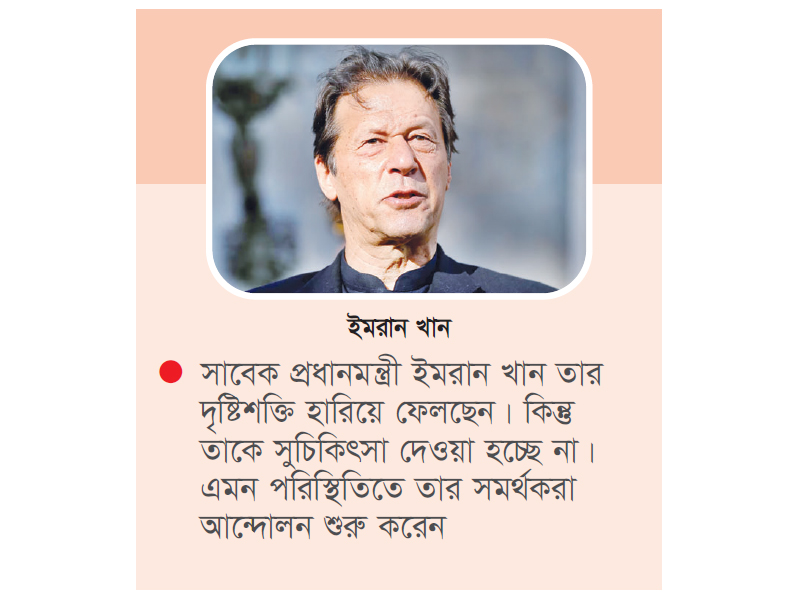 সম্প্রতি জানা গেছে, সাবেক প্রধানমন্ত্রী ইমরান খান তার দৃষ্টিশক্তি হারিয়ে ফেলছেন। কিন্তু তাকে সুচিকিৎসা দেওয়া হচ্ছে না। এমন পরিস্থিতিতে তার সমর্থকরা আন্দোলন শুরু করেন। এরপর তাকে হাসপাতালে নেওয়ার ব্যবস্থা করা হচ্ছে।