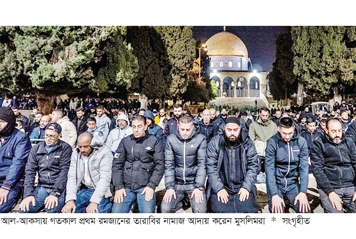 মধ্যপ্রাচ্যের অন্যান্য দেশ ও অঞ্চলের মতো ফিলিস্তিনেও গত মঙ্গলবার চাঁদ দেখা গেছে; ফলে ইসলাম ধর্মের নিয়ম অনুযায়ী গতকাল সন্ধ্যার পর প্রথম তারাবির নামাজ পড়েছেন মুসলিমরা। ইসলাম ধর্মের তৃতীয় গুরুত্বপূর্ণ মসজিদ আল আকসায় গত মঙ্গলবার চলতি বছরের ১ম রমজানের তারাবির নামাজ আদায় করেছেন হাজারো মুসল্লি। গতকাল বুধবার এক প্রতিবেদনে এ তথ্য জানিয়েছে তুরস্কের সরকারি বার্তাসংস্থা আনাদোলু এজেন্সি। গত মঙ্গলবার আল আকসায় প্রথম তারাবিতে ইমামতি করেছেন আল-আকসার খতিব শেখ ইউসুফ আবু স্নেইনেহ।