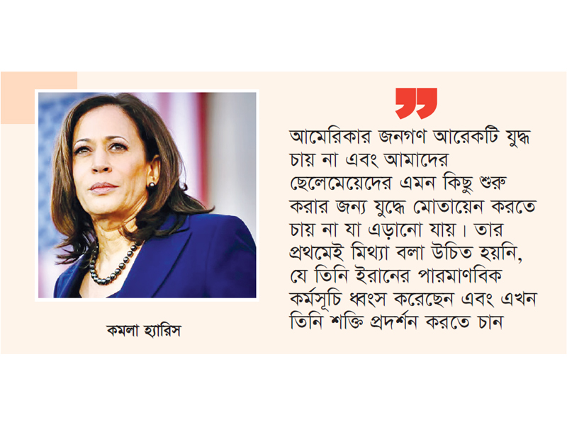তিনি বলেন, ট্রাম্প আগে দাবি করেছিলেন যে ইরানের পারমাণবিক কর্মসূচিকে তিনি সম্পূর্ণরূপে ধ্বংস করে দিয়েছে, অথচ তার ওই বক্তব্য ছিল সম্পূর্ণ মিথ্যা এবং তিনি এখন এই অঞ্চলে মার্কিন বাহিনী পাঠিয়েছেন যেখানে আমেরিকান পুরুষ এবং মহিলাদের যুদ্ধের মুখে ঠেলে দেওয়া হবে। হ্যারিস আরও বলেন, ‘আমেরিকার জনগণ আরেকটি যুদ্ধ চায় না এবং আমাদের ছেলেমেয়েদের এমন কিছু শুরু করার জন্য যুদ্ধে মোতায়েন করতে চায় না যা এড়ানো যায়।