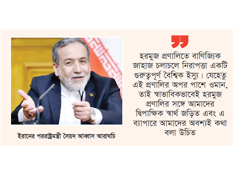 প্রসঙ্গত, আরব সাগর ও পারস্য উপসাগরকে সংযোগকারী ১৬৭ কিলোমিটার দীর্ঘ হরমুজ প্রণালি বিশ্বের অন্যতম গুরুত্বপূর্ণ বাণিজ্য জলপথ। এই প্রণালির এক তীরে ইরান এবং অপর তীরে ওমান অবস্থিত। আরাঘচির ওমান সফরের কারণও ছিল হরমুজ প্রণালি ইস্যু। সেন্ট পিটার্সবার্গে পৌঁছানোর পর ইরানি সংবাদমাধ্যম ইরনাকে এ প্রসঙ্গে তিনি বলেছেন, ‘হরমুজ প্রণালিতে বাণিজ্যিক জাহাজ চলাচলে নিরাপত্তা একটি গুরুত্বপূর্ণ বৈশ্বিক ইস্যু। যেহেতু এই প্রণালির অপর পাশে ওমান, তাই স্বাভাবিকভাবেই হরমুজ প্রণালির সঙ্গে আমাদের দ্বিপাক্ষিক স্বার্থ জড়িত এবং এ ব্যাপারে আমাদের অবশ্যই কথা বলা উচিত।’