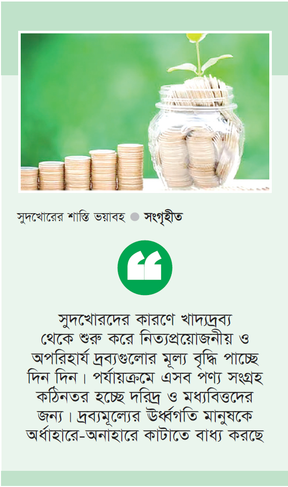সুদের পরিণাম ভয়াবহ : সুদখোরদের কারণে খাদ্যদ্রব্য থেকে শুরু করে নিত্যপ্রয়োজনীয় ও অপরিহার্য দ্রব্যগুলোর মূল্য বৃদ্ধি পাচ্ছে দিন দিন। পর্যায়ক্রমে এসব পণ্য সংগ্রহ কঠিনতর হচ্ছে দরিদ্র ও মধ্যবিত্তদের জন্য। দ্রব্যমূল্যের ঊর্ধ্বগতি মানুষকে অর্ধাহারে-অনাহারে কাটাতে বাধ্য করছে। সর্বসাধারণের ক্রয়ক্ষমতার সীমা অতিক্রম করে অশ্বের মতো দ্রুতগতিতে বেড়ে চলছে প্রতিটি পণ্যের মূল্য। তাই ব্যক্তি, সমাজ ও অর্থনীতিকে ক্ষতির হাত থেকে রক্ষা করার জন্য সুদ বর্জন করতে হবে। কোরআন ও হাদিসে সুদ খাওয়া, সুদ দেওয়া এবং সুদের সঙ্গে কোনোরূপ সংশ্লিষ্টতার কারণে পরকালে কঠিন শাস্তির সতর্কবাণী উচ্চারণ করা হয়েছে। আল্লাহতায়ালা বলেন, ‘যারা সুদ খায়, তারা (কেয়ামতের দিন) সেই ব্যক্তির মতো দাঁড়াবে, শয়তান যাকে স্পর্শ দ্বারা পাগল বানিয়েছে। এটা এ জন্য যে, তারা বলে, ক্রয়-বিক্রয় তো সুদের মতোই। অথচ আল্লাহ ক্রয়-বিক্রয়কে হালাল করেছেন এবং সুদকে করেছেন হারাম। যার কাছে তার প্রতিপালকের উপদেশ এসেছে এবং সে (সুদি কারবার হতে) বিরত হয়েছে, তবে অতীতে যা হয়েছে, তা তারই। আর তার (অভ্যন্তরীণ অবস্থার) ব্যাপার আল্লাহর এখতিয়ারে। আর যারা পুনরায় (সে কাজই) করবে, তারা জাহান্নামের অধিবাসী হবে। সেখানে তারা সর্বদা থাকবে।’ (সুরা বাকারা : ২৭৫)।