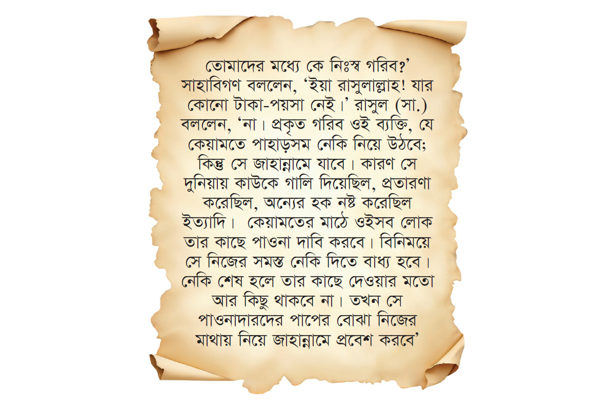 কেয়ামতের মাঠে ওইসব লোক তার কাছে পাওনা দাবি করবে। বিনিময়ে সে নিজের সমস্ত নেকি দিতে বাধ্য হবে। নেকি শেষ হলে তার কাছে দেওয়ার মতো আর কিছু থাকবে না। তখন সে পাওনাদারদের পাপের বোঝা নিজের মাথায় নিয়ে জাহান্নামে প্রবেশ করবে।’ (মুসলিম : ৬৩৪৩)। তিন. হাশরবাসীর সামনে লাঞ্ছনা। রাসুল (সা.) বলেন, ‘প্রত্যেক প্রতারকের জন্য কেয়ামতের দিন তার (নিতম্বের) ওপর একটি পতাকা থাকবে। আর পতাকা বিশ্বাসঘাতকতার পরিমাণ অনুযায়ী উঁচু করা হবে। সাবধান! জনগণের শাসক হয়েও যে বিশ্বাসঘাতকতা করে, তার চেয়ে বড় প্রতারক আর নেই।’ (মুসলিম : ৪৩৮৮)।