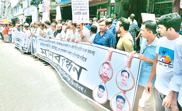 ঝিনাইদহ-৪ সংসদীয় আসনের সংসদ সদস্য ও কালীগঞ্জ উপজেলা আওয়ামী লীগের সভাপতি আনোয়ারুল আজিম আনারকে নৃশংসভাবে হত্যা ও পরিকল্পনাকারীদের দৃষ্টান্তমূলক শাস্তি ও ফাঁসির দাবিতে মানববন্ধন করেছে কালীগঞ্জ পৌর ব্যবসায়ী সমিতি। গতকাল সকালে শহরের জনতা মোড়ে কালীগঞ্জ পৌর ব্যবসায়ী সমিতির সভাপতি আসাদুজ্জামানের সভাপতিত্বে ঘন্টাব্যাপী এ মানবন্ধন কর্মসূচি পালিত হয়। এ সময়ে এমপি আনারকে হত্যার পরিকল্পনাকারীদের ফাঁসি চাই, এমপি আনার নিখোঁজ হলে সন্ধান চাই, হত্যা করা হলে দেহাবশেষ ও আলামত চাই- ইত্যাদি প্লাকার্ড ব্যবসায়ীদের হাতে দেখা যায়।