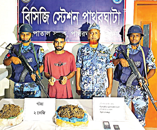 বরগুনার পাথরঘাটায় দুই কেজি গাঁজাসহ একজন মাদক কারবারিকে আটক করেছে কোস্ট গার্ড। গতকাল বুধবার দুপুরে কোস্ট গার্ড সদর দপ্তরের মিডিয়া কর্মকর্তা লেফটেন্যান্ট কমান্ডার খন্দকার মুনিফ তকি এ তথ্য জানান। তিনি বলেন, গোপন সংবাদের ভিত্তিতে গত মঙ্গলবার কোস্ট গার্ড দক্ষিণ জোনের বিসিজি স্টেশন পাথরঘাটা কর্তৃক বরগুনা জেলার পাথরঘাটা উপজেলাধীন নাচনাপাড়া ইউনিয়নের জ্ঞানপাড়া এলাকার মেইন রোডে একটি বিশেষ অভিযান চালায়। এ সময় দুই কেজি গাঁজাসহ মাদক ব্যবসায়ী মো. ইমনকে (২১) আটক করা হয়। আটক ইমন নাচনাপাড়া ইউনিয়নের ৪নং ওয়ার্ডস্থ বাঁশতলা এলাকার বাসিন্দা। তিনি আরও বলেন, পরবর্তীতে আইনানুগ ব্যবস্থা গ্রহণের জন্য সব আলামতসহ আটককৃত মাদক কারবারিকে পাথরঘাটা থানায় হস্তান্তর করা হয়।