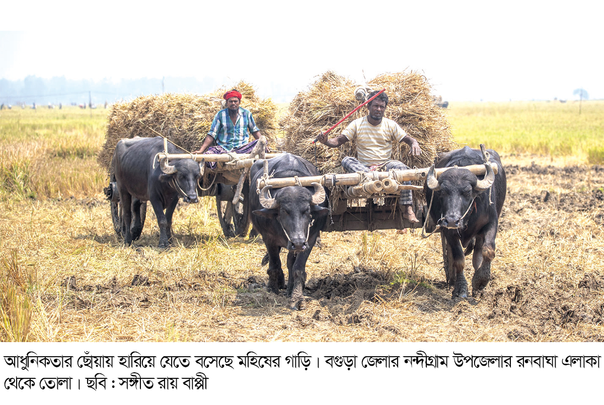 আধুনিকতার ছোঁয়ায় ও কালের বিবর্তনে হারিয়ে যাচ্ছে গ্রামবাংলার ঐতিহ্যবাহী মহিষের গাড়ি। একসময় গরু বা মহিষের গাড়িতে মানুষ এক স্থান থেকে অন্য স্থানে এমনকি সামাজিক অনুষ্ঠানে সকল শ্রেণির মানুষ যাতায়াত করতো। বগুড়া জেলার নন্দীগ্রাম, ধুনট, সারিয়াকান্দি, কাহালু, শিবগঞ্জ, সোনাতলা, আদমদীঘি, দুপচাঁচিয়া, গাবতলী, শাজাহানপুরের প্রত্যন্ত অঞ্চলের কৃষকরা তাদের জমিতে উৎপাদিত ফসল পরিবহনের জন্য এবং ব্যবসা বাণিজ্যসহ বিভিন্ন পণ্যসামগ্রী আনা-নেয়ার কাজেও ব্যবহার করতো মহিষের গাড়ি। আশির দশকে গরু বা মহিষের গাড়ির প্রচলন থাকলেও বর্তমান আধুনিক বিজ্ঞান ও তথ্যপ্রযুক্তির ছোঁয়ায় মানুষ এখন মহিষের গাড়ি রেখে ট্রেন, বাস, আর ট্রাকের সাথে উন্নততর জীবন পরিচালনা করছে। মহিষের গাড়িতে যেখানে একস্থান থেকে অন্যস্থানে যাতায়াত করতে দিন পেরিয়ে যেত। সেখানে এখন আধুনিক পরিবহন ব্যবহারে সময় লাগে মাত্র কয়েক ঘণ্টা। এ কারণে মহিষের গাড়ি তেমন আর দেখা যায় না। তবে অতিসম্প্রতি নন্দীগ্রাম উপজেলার রনবাঘা এলাকায় মহিষের গাড়ি চোখে পড়ে।