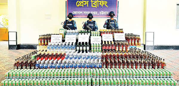 চট্টগ্রামের মেরিন ড্রাইভ এলাকা থেকে প্রায় সাড়ে ৪ কোটি টাকা মূল্যের বিদেশি মদ ও বিয়ার জব্দ করেছে কোস্ট গার্ড। গতকাল শনিবার কোস্ট গার্ড মিডিয়া কর্মকর্তা লেফটেন্যান্ট কমান্ডার এইচএমএম হারুন-অর-রশীদ এ তথ্য জানান। তিনি বলেন, গোপন সংবাদের ভিত্তিতে ভোর ৫টায় কোস্ট গার্ড বেইস চট্টগ্রাম কর্তৃক চট্টগ্রামের হালিশহর থানার ডগির খাল এলাকায় একটি বিশেষ অভিযান চালানো হয়। অভিযান চলাকালীন ওই এলাকায় সন্দেহজনক কয়েকজন ব্যক্তিকে একটি ডেনিশ বোট হতে বস্তা নামাতে দেখা যায়। এ সময় আভিযানিক দল কর্তৃক ওই ব্যক্তিদের থামার সংকেত দিলে তারা বোট এবং বস্তাগুলো জঙ্গলে ফেলে পার্শ্ববর্তী প্যারাবন দিয়ে পালিয়ে যায়। পরে আটককৃত বোট এবং খালের পার্শ্ববর্তী জঙ্গল তৎসংলগ্ন এলাকাতে তল্লাশি চালিয়ে পরিত্যক্ত অবস্থায় আনুমানিক ৪ কোটি ১৫ লাখ ১৩ হাজার টাকা মূল্যের ১ হাজার ৫৬ ক্যান হাইনেকেন অরিজিনাল বিয়ার, ১ হাজার ১৬১ বোতল বিদেশি মদ এবং ৪ বোতল টুইন ভ্যালি অলিভ ওয়েল জব্দ করা হয়। কোস্ট গার্ডের উপস্থিতি টের পেয়ে পাচারকারীরা পালিয়ে যাওয়ায় কাউকে আটক করা সম্ভব হয়নি। আটককৃত বোট ও মাদকদ্রব্যের পরবর্তী আইনানুগ ব্যবস্থা গ্রহণের কার্যক্রম প্রক্রিয়াধীন রয়েছে বলে জানান লেফটেন্যান্ট কমান্ডার এইচএমএম হারুন-অর-রশীদ।
