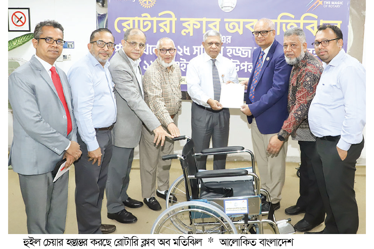 বিমান বাংলাদেশ এয়ারলাইন্সের হজযাত্রীদের জন্য হুইল চেয়ার হস্তান্তর করেছে রোটারি ক্লাব অব মতিঝিল। বলাকা ভবনে সম্প্রতি এক অনুষ্ঠানের মধ্যে দিয়ে এই হুইল চেয়ারগুলো হস্তান্তর করা হয়। রোটারি ক্লাব অব মতিঝিলের পক্ষে আরটিএন, পিপি আবদুস শাকুর চৌধুরী এমপিএইচএফ, এমসি, বি, এমডি ১২টি হুইল চেয়ার বিমান বাংলাদেশ এয়ারলাইন্সের ব্যবস্থাপনা পরিচালক ও সিইও ড. মো: সাফিকুর রহমানের কাছে হস্তান্তর করেন। এ সময় অন্যান্যদের মধ্যে উপস্থিত ছিলেন বিমান বাংলাদেশ এয়ারলাইন্সের বিপণন ও বিক্রয় পরিদপ্তরের পরিচালক আশরাফুল আলম, জনসংযোগ বিভাগের মহাব্যবস্থাপক এ,বি,এম, রওশন কবীর, রোটারি ক্লাব অব মতিঝিলের আরটিএন, পিপি সত্য রঞ্জন সাহা এমপিএইচএফ ও আরটিএন, পিপি মসিহ্ মালিক চৌধুরী এফসিএ, এলএলবি, এফসিএস, এমপিএইচএফ। এসময়ে বিমানের ব্যবস্থাপনা পরিচালক ও সিইও ড. মো: সাফিকুর রহমান বলেন- হুইল চেয়ারগুলোর সংযোজনের ফলে হজক্যাম্প ও হযরত শাহজালাল আন্তর্জাতিক বিমানবন্দরে বিমানের পক্ষ থেকে হজযাত্রীদের হজযাত্রা অধিক আরামদায়ক ও নিরাপদ হবে। তিনি রোটারি ক্লাব অব মতিঝিলের সকল সদস্যকে ধন্যবাদ জ্ঞাপন করেন।