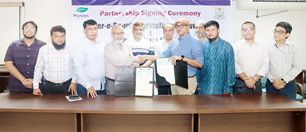 শেরেবাংলা কৃষি বিশ্ববিদ্যালয়ের সঙ্গে গতকাল প্লানটেন এগ্রো লিমিটেডের এক সমঝোতা চুক্তি স্বাক্ষরিত হয়। প্লানটেন এগ্রো লিঃ ডাচ কৃষি-প্রযুক্তি সংস্থার অঙ্গ প্রতিষ্ঠান। এই প্রযুক্তিটি ডধমবহরহমবহ টহরাবৎংরঃু উদ্ভাবন করেছে। মোবাইল অ্যাপসের মাধ্যমে আবাদী জমির আর্দ্রতার মাত্রা, জৈববস্তু শনাক্তকরণ, ক্লোরোফিলের মাত্রা পর্যবেক্ষণ করা যাবে এবং স্যাটেলাইট ডেটা সংগ্রহ করা যাবে। অনুষ্ঠানে প্রধান অতিথি হিসেবে উপস্থিত ছিলেন শেরেবাংলা কৃষি বিশ্ববিদ্যালয়ের উপাচার্য অধ্যাপক ড. মো. আব্দুল লতিফ। তিনি তার শুভেচ্ছা বক্তব্যে বলেন, এটি একটি অত্যাধুনিক প্রযুক্তি, বর্তমান যুগের সঙ্গে তাল মিলিয়ে চলতে হলে আমাদের শিক্ষার্থীদের এর প্রশিক্ষণ দিতে হবে। এটা করতে প্লানটেন এগ্রো লিঃ অগ্রণী ভূমিকা পালন করবে। বিশেষ অতিথি হিসেবে উপস্থিত ছিলেন বিশ্ববিদ্যালয়ের উপ-উপাচার্য অধ্যাপক ড. মো. বেলাল হোসেন। অতিথি হিসেব উপস্থিত ছিলেন প্রক্টর অধ্যাপক ড. মো. আরফান আলী। প্লানটেন এগ্রো লিমিটেডের পক্ষে উপস্থিত ছিলেন প্রতিষ্ঠানটির ম্যানেজিং ডিরেক্টর গোলাম ফারুক, জেনারেল ম্যানেজার দেবাশীষ ভট্টাচার্য্য, চিফ ইনোভেশন অফিসার নাসির আহমেদ, হেড অফ ফাইন্যান্স আবাব সালেহীন এবং হেড অফ মার্কেট ডেভেলপমেন্ট মো. জসিম উদ্দীন। অনুষ্ঠানের কো-অর্ডিনেটরের দায়িত্ব পালন করেন শেকৃবির উদ্যানতত্ত্ব বিভাগের অধ্যাপক ড. জসিম উদ্দিন।