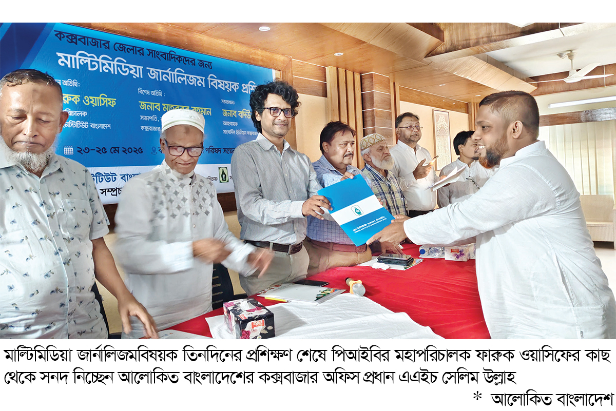 সাংবাদিক ইউনিয়ন কক্সবাজারের অ্যাডহক কমিটির সদস্য মুহাম্মদ আবু সিদ্দিক ওসমানীর সঞ্চালনায় অনুষ্ঠানে বিশেষ অতিথির বক্তব্য রাখেন কক্সবাজার প্রেসক্লাবের সভাপতি মাহবুবর রহমান। প্রেস ইনস্টিটিউট বাংলাদেশ (পিআইবি)-এর ৩ দিনের মাল্টিমিডিয়া জার্নালিজমবিষয়ক প্রশিক্ষণ শেষে মহাপরিচালক ফারুক ওয়াসিফের কাছ থেকে সনদ গ্রহণ করেন সবাই। সাংবাদিক ইউনিয়ন কক্সবাজারের প্রতিষ্ঠাতা সদস্য ও কক্সবাজার প্রেসক্লাবের প্রতিষ্ঠাতা সদস্য প্রবীণ সাংবাদিক এস এম আমিনুল হক চৌধুরীর সভাপতিত্বে মাল্টিমিডিয়া জার্নালিজম প্রশিক্ষণ শেষে প্রশিক্ষণার্থীদের মাঝে সনদ বিতরণ করা হয়। তিনদিন ব্যাপী মাল্টিমিডিয়া জার্নালিজমবিষয়ক প্রশিক্ষণ সমন্বয় করেন পিআইবির সহকারী প্রশিক্ষক জিলহাজ উদ্দিন নিপুন। সমাপনী অনুষ্ঠানে আরও উপস্থিত ছিলেন, কক্সবাজার প্রেসক্লাব সাধারণ সম্পাদক মমতাজ উদ্দিন বাহারি, সিনিয়র সাংবাদিক যথাক্রমে কামাল হোসেন আজাদ, নুরুল ইসলাম হেলালি, শামসুল হক শারেক, ইকরাম চৌধুরী টিপুসহ সিনিয়র সাংবাদিক ও পিআইবি কর্মকর্তাবৃন্দ। অনুষ্ঠানে প্রশিক্ষণের অনুভূতি প্রকাশ করেন সাংবাদিক ইমাম খাইর ও শাহেদ মিজান।